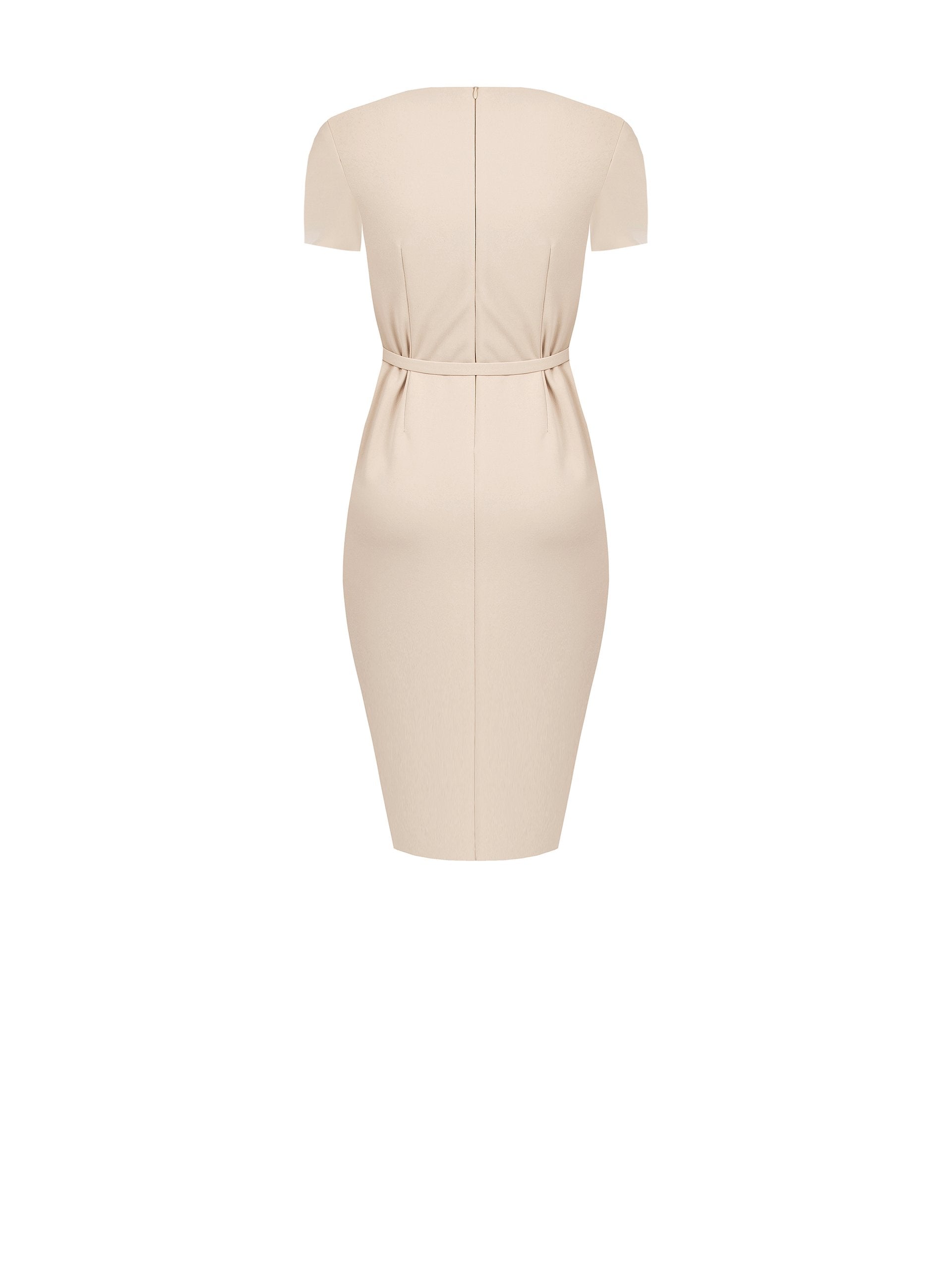 Struttura e raffinatezza. Questo abito in scuba crepe firmato Rinascimento unisce la tenuta impeccabile del tessuto tecnico all'eleganza di un design contemporaneo.