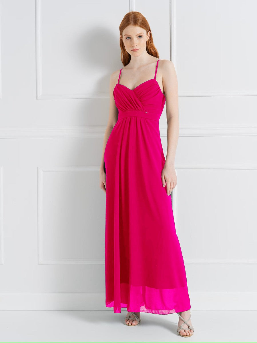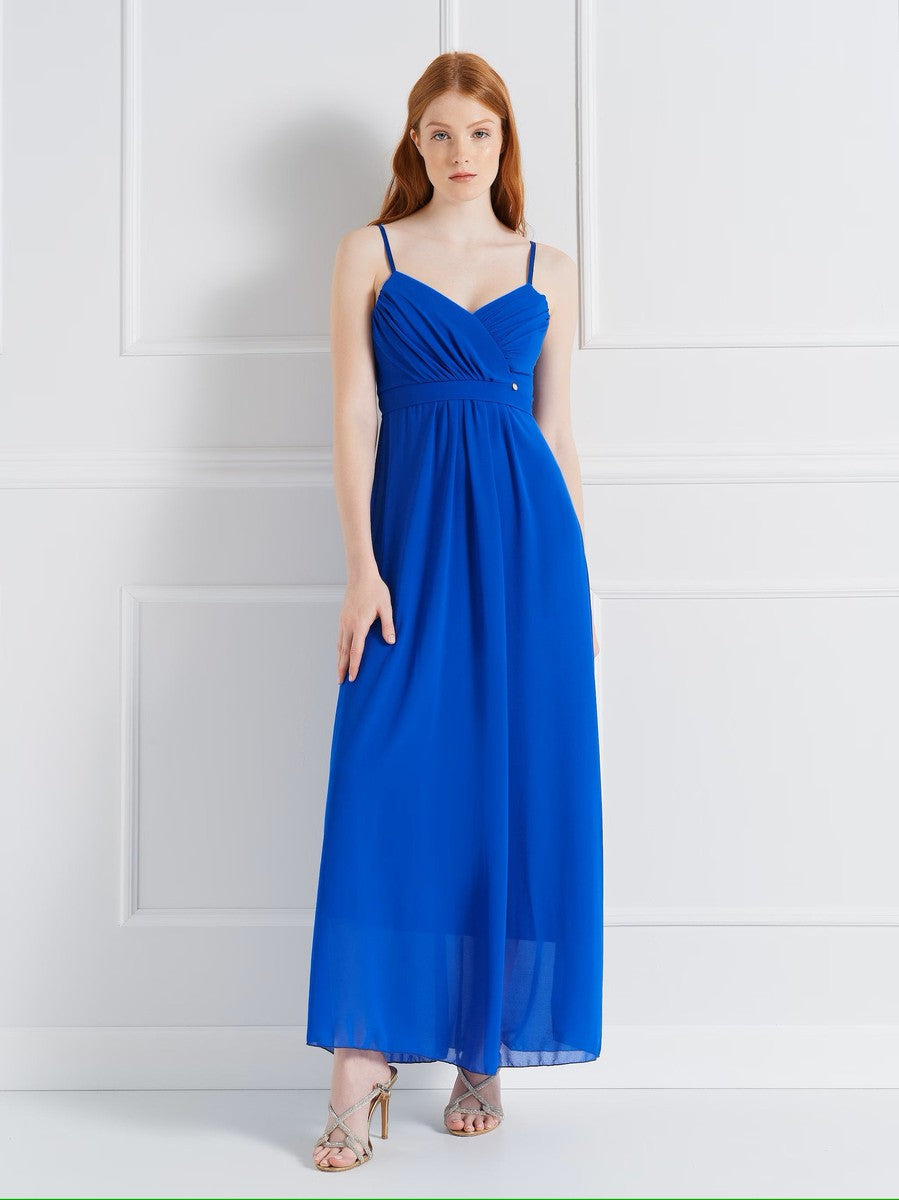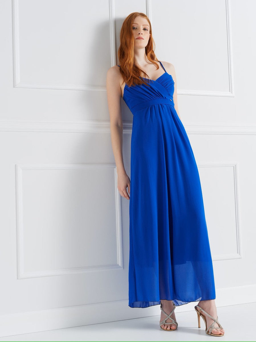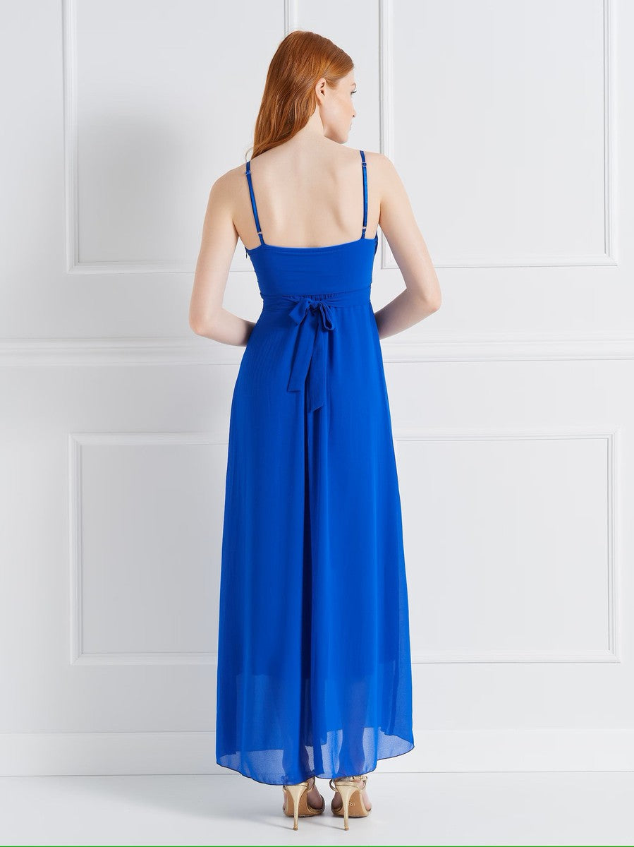 Abito lungo, Rinascimento modello impero, in georgette stampa floreale. L'abito ha lo scollo a cuore e le spalline regolabili. La fascia in vita permette di stringere l'abito, regolandolo. L'abito ha un sottogonna in jersey sur-ton e la zip laterale, nascosta. Il capo è interamente prodotto in Italia. La modella è alta 1,76 m ed indossa la taglia S.