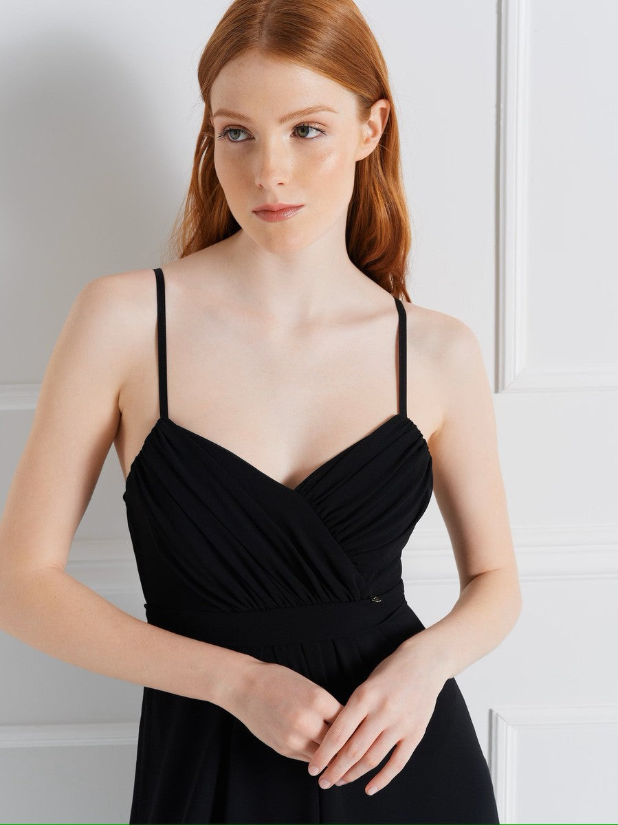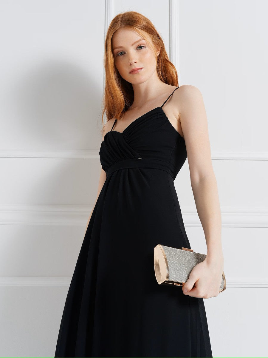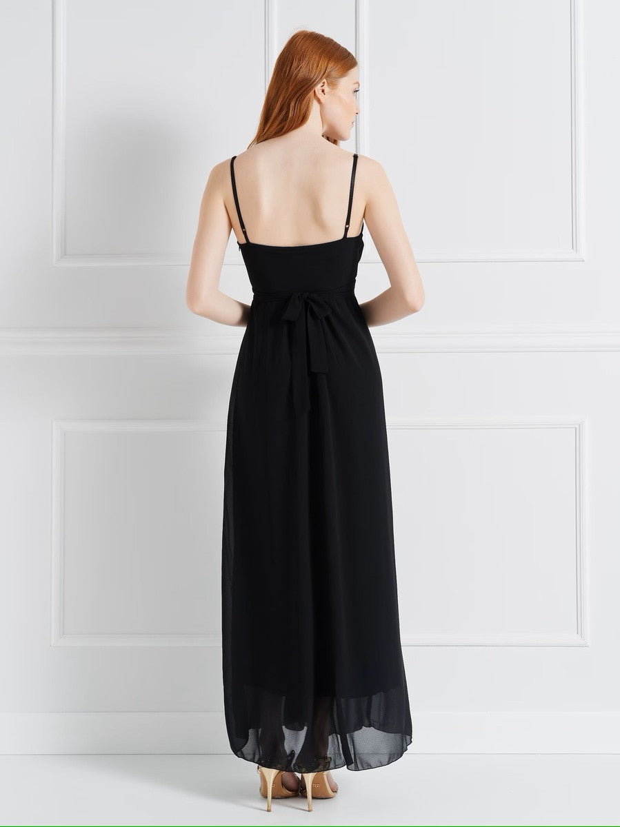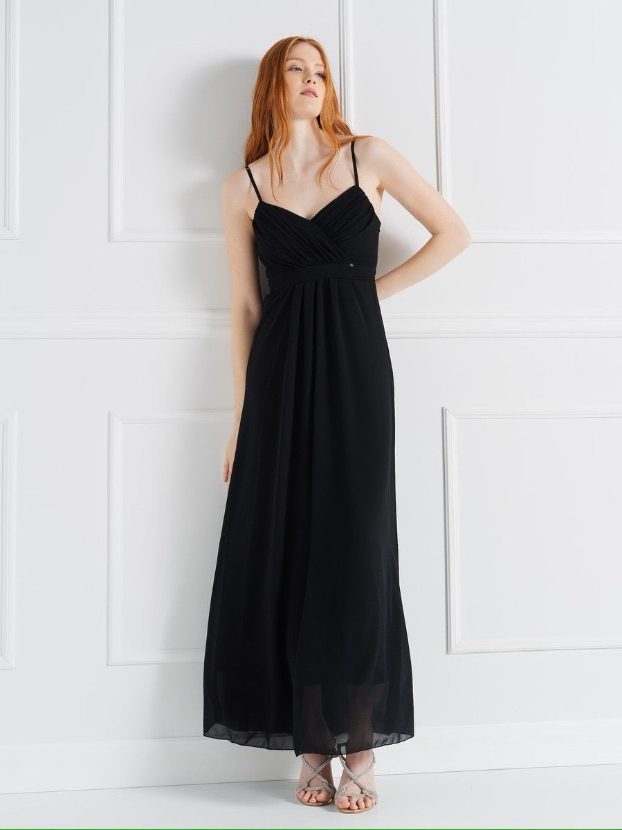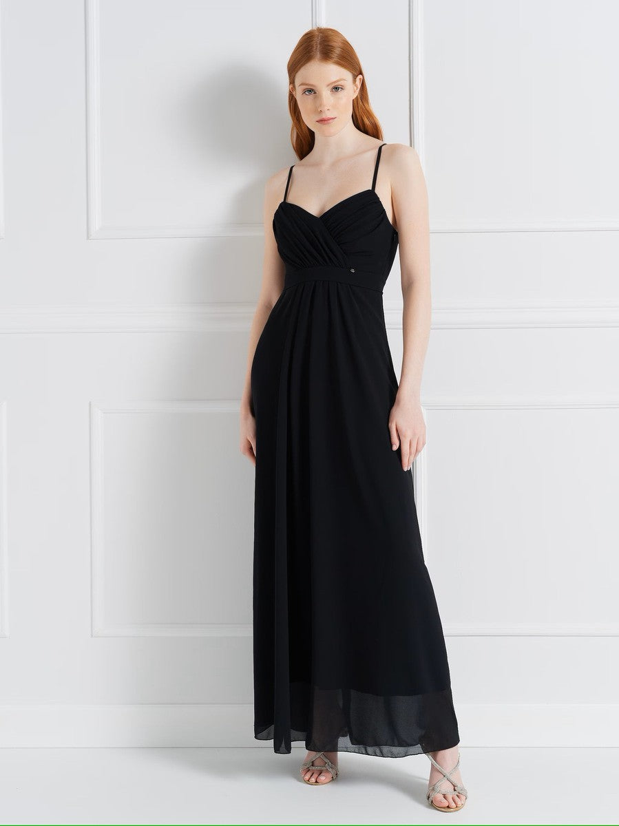 Abito lungo, Rinascimento modello impero, in georgette stampa floreale. L'abito ha lo scollo a cuore e le spalline regolabili. La fascia in vita permette di stringere l'abito, regolandolo. L'abito ha un sottogonna in jersey sur-ton e la zip laterale, nascosta. Il capo è interamente prodotto in Italia. La modella è alta 1,76 m ed indossa la taglia S.