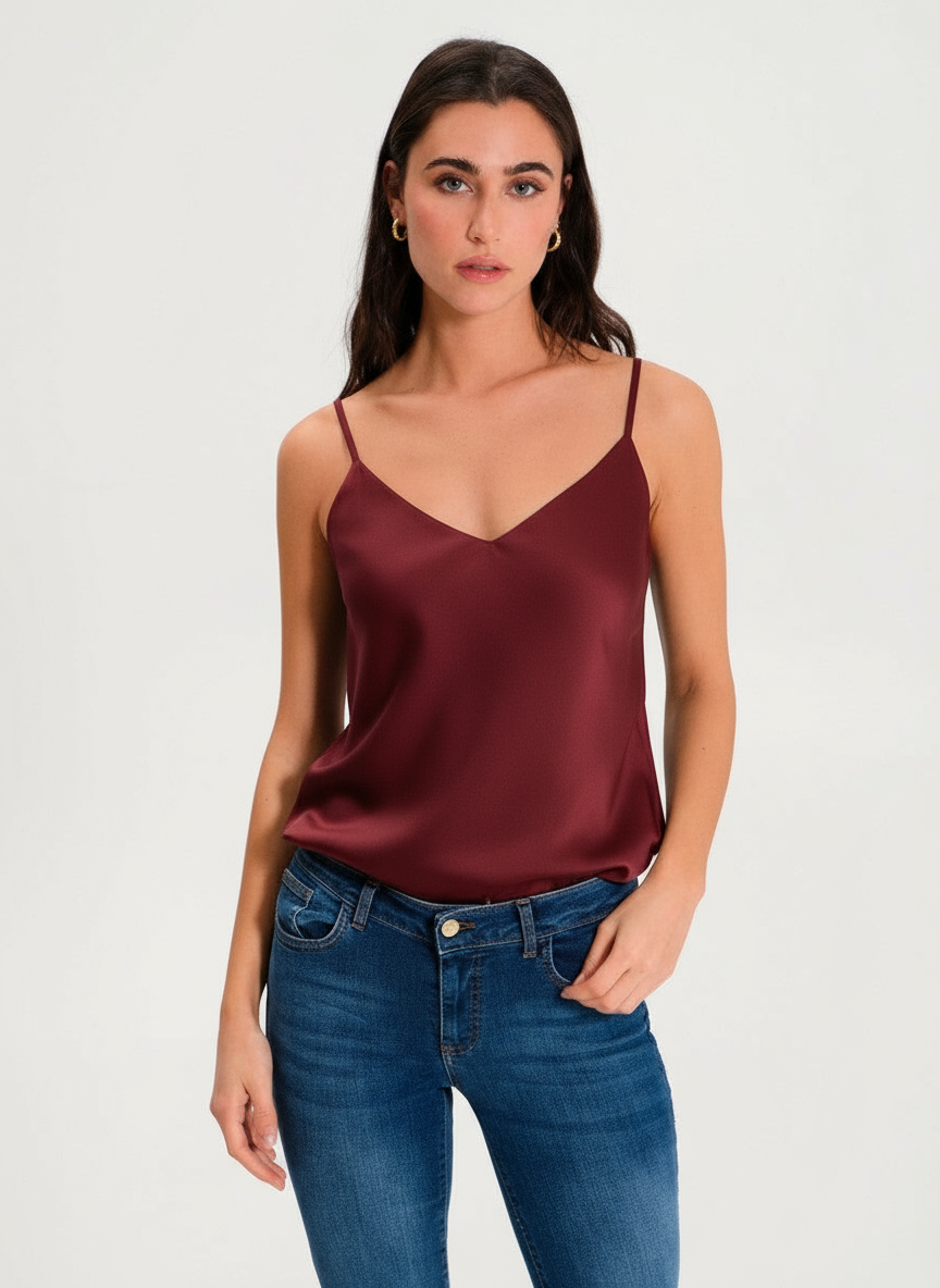 Top realizzato in raso, con scollo a "V", spalline sottili e regolabili. Il top basico è ideale come sotto giacca, da abbinare a gonne e pantaloni, per completare il tuo look in ogni occasione. Il capo è prodotto interamente in Italia. La modella è alta 1,75 ed indossa la taglia S.