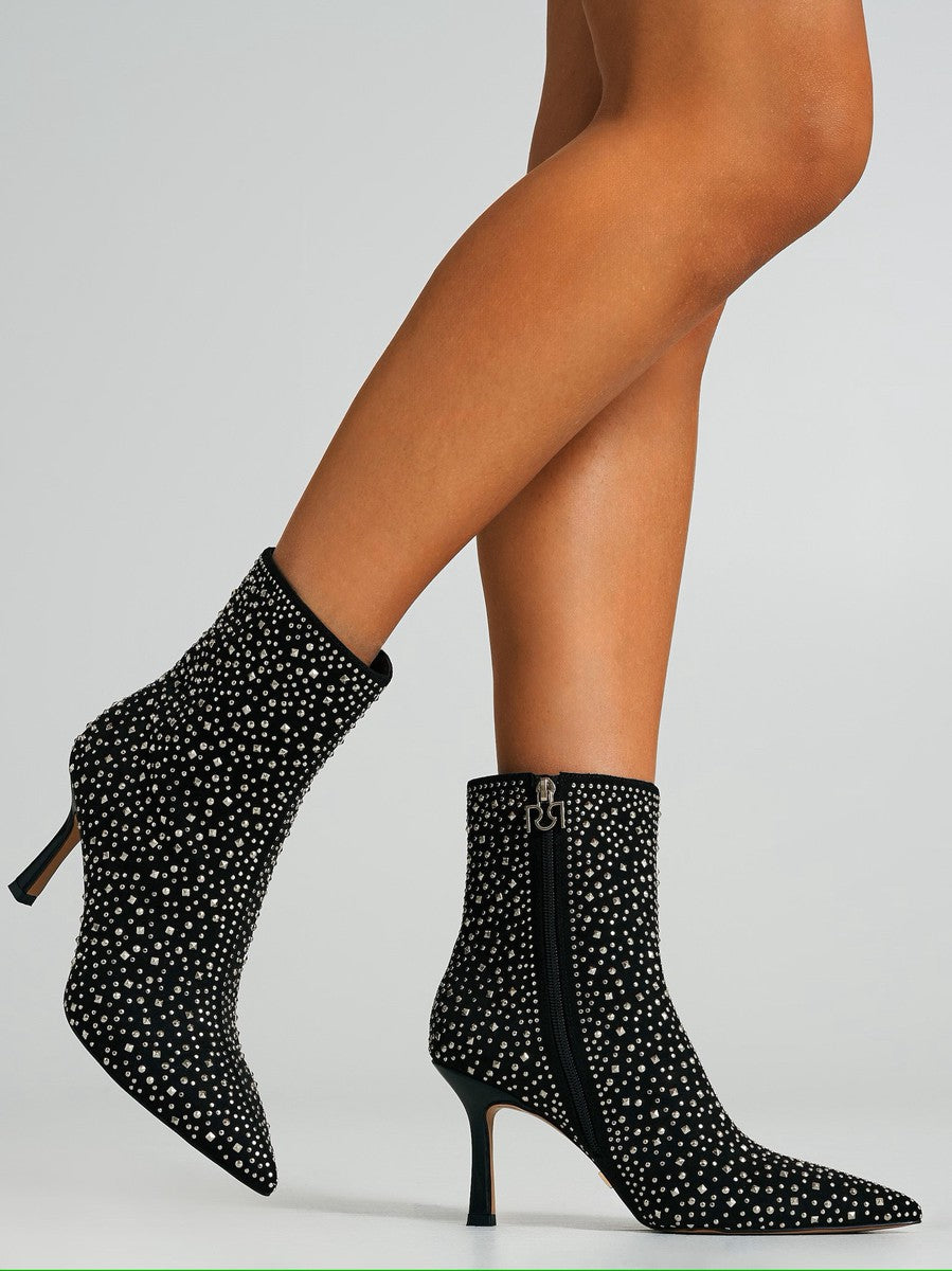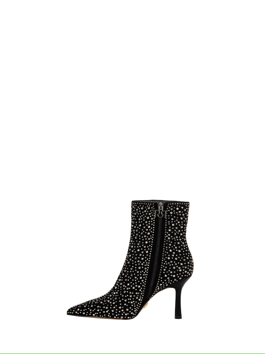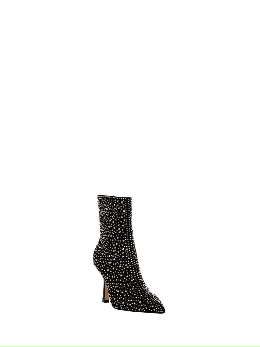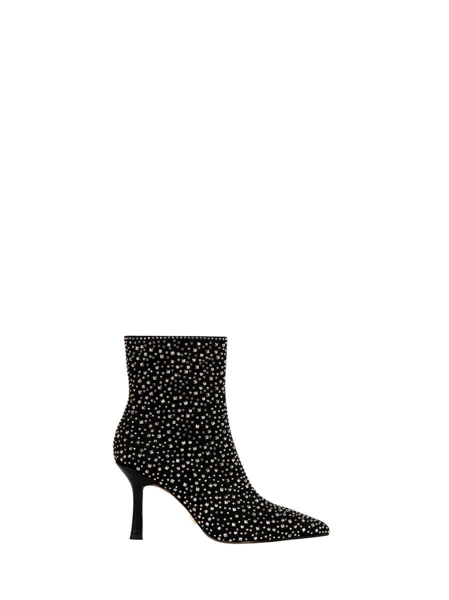 Tronchetto con tacco sottile con borchie di diverse forme e dimensioni. Chiusura tramite zip posizionata sul lato interno con cursore logato che conferisce una comoda vestibilità, altezza sopra la caviglia. Indossa lo stivaletto per completare i tuoi look da sera con un tocco rock.