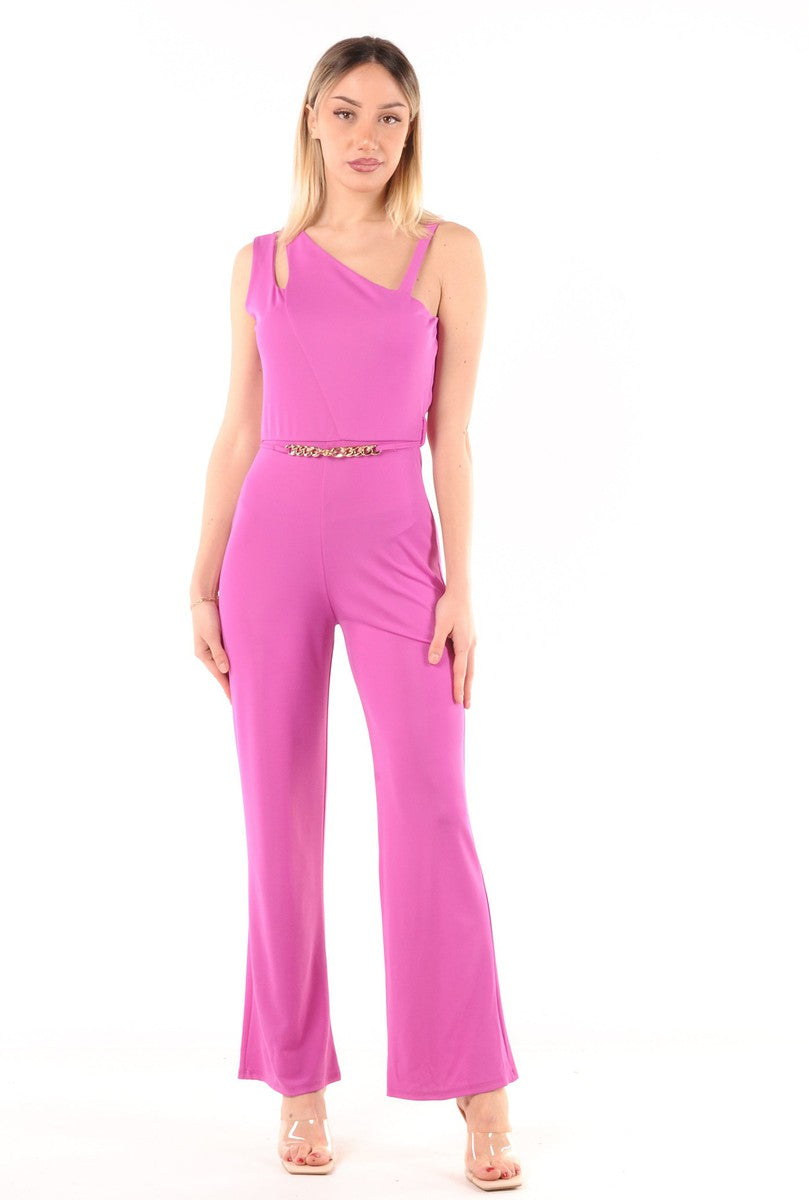Tuta Palazzo lunga con Catena oro monospalla. Il capo è interamente Made In Italy.