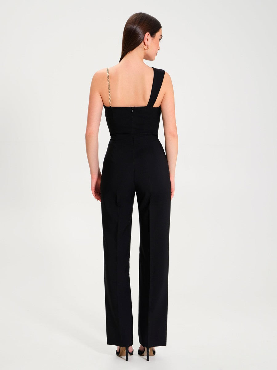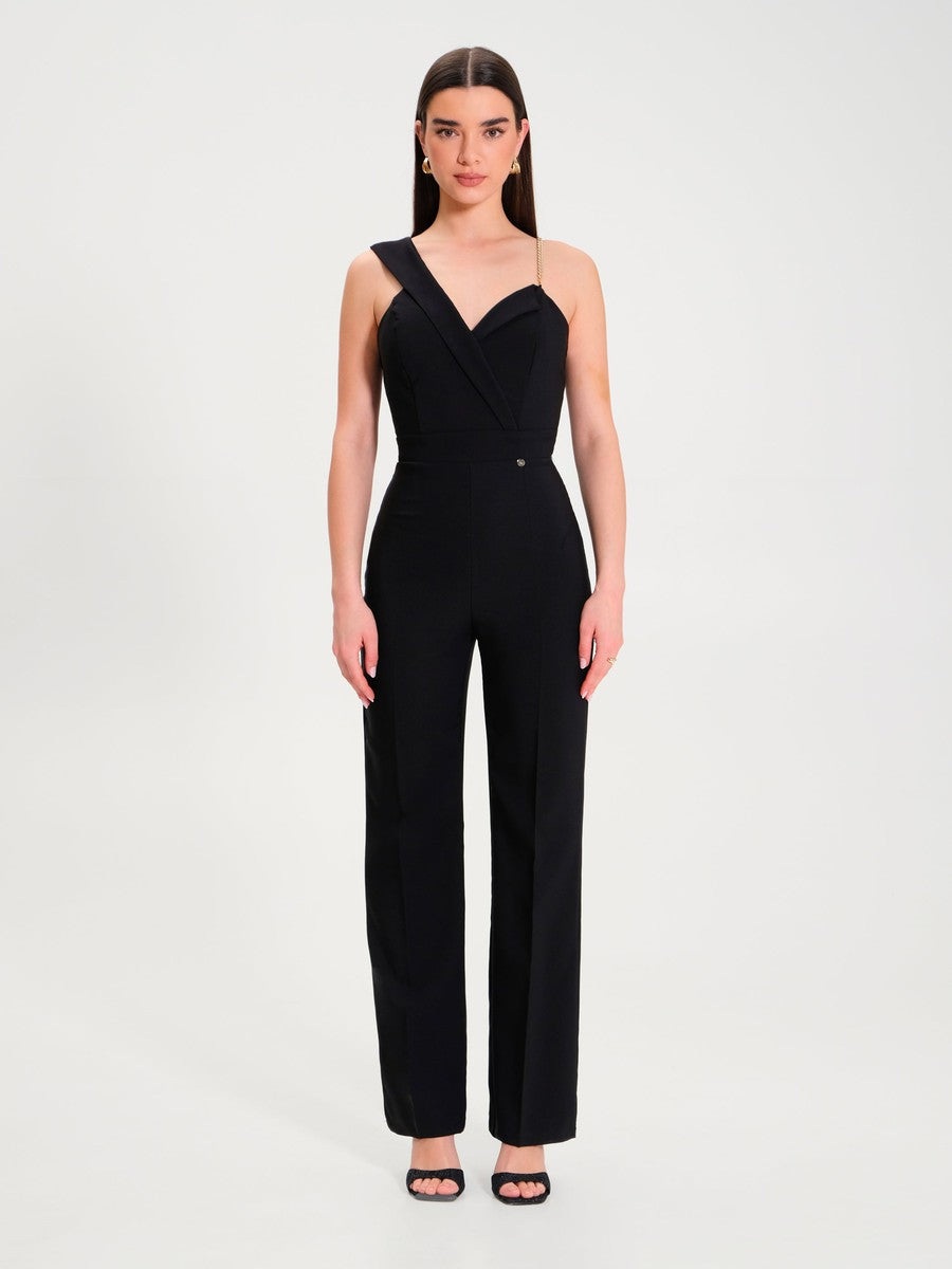 Tuta con pantaloni a palazzo, realizzata in tessuto scuba crepe. La tuta ha uno a V con una spallina larga in tessuto e l'altra con inserto in catena metallica color oro. Fascetta in vita che definisce alla perfezione la silhouette. Chiusura tramite zip a scomparsa sul retro. Capo elegante da indossare di sera, puoi completare il look con un maxi blazer in scuba crepe o un giubbino in similpelle per un look più grintoso e attuale. Il capo è interamente made in Italy. La modella è alta 1,75 ed indossa la taglia S.