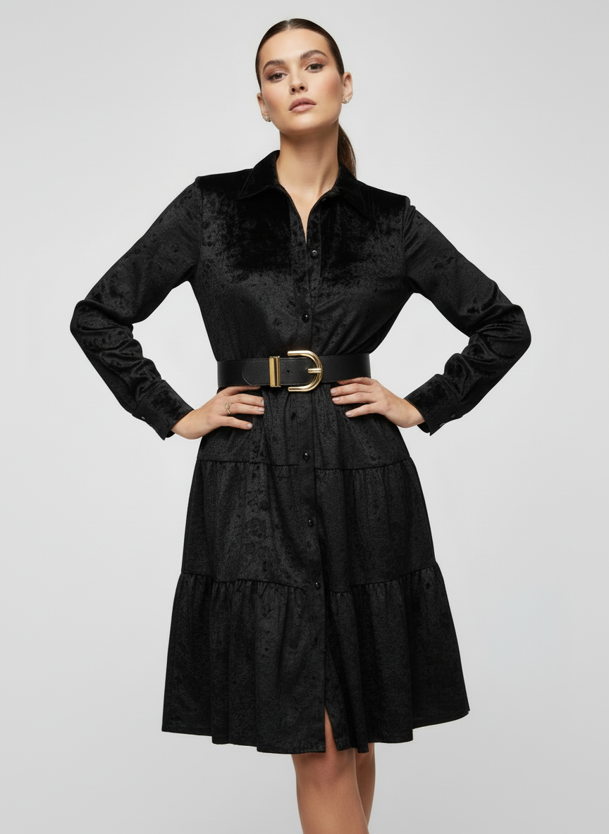 Abito Chemisier Velluto Questo abito chemisier in velluto combina eleganza senza tempo con comfort contemporaneo. La silhouette strutturata e il tessuto morbido in velluto creano un capo versatile perfetto per occasioni speciali e look quotidiani raffinati. I dettagli della camicia garantiscono una vestibilità impeccabile, mentre la texture lussuosa aggiunge profondità e movimento. Un pezzo essenziale per chi ricerca qualità e stile in un'unica soluzione.