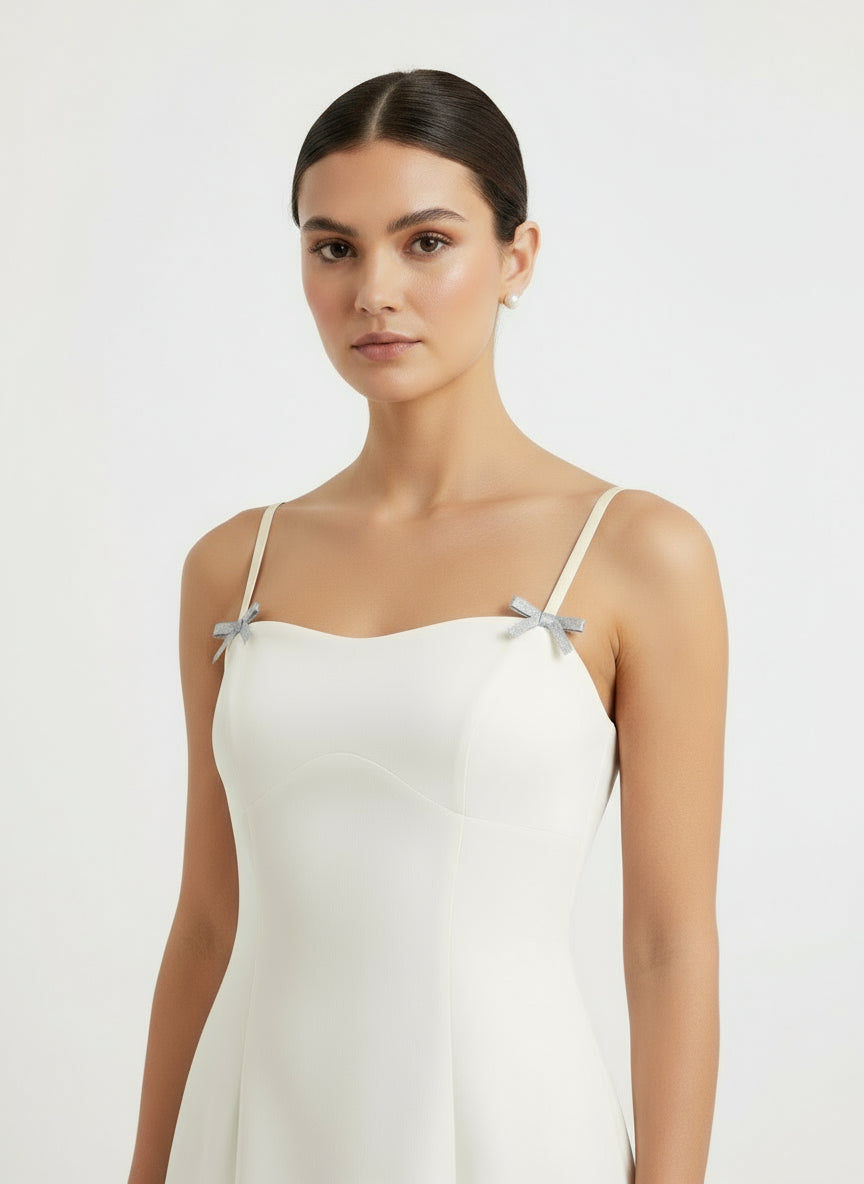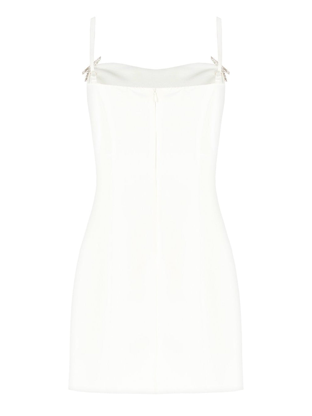 Abito Corto Svasato in Tessuto Tecnico con Spille Fiocco in Strass