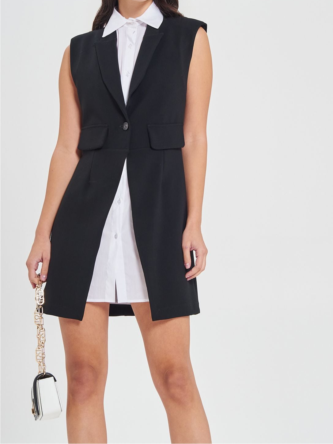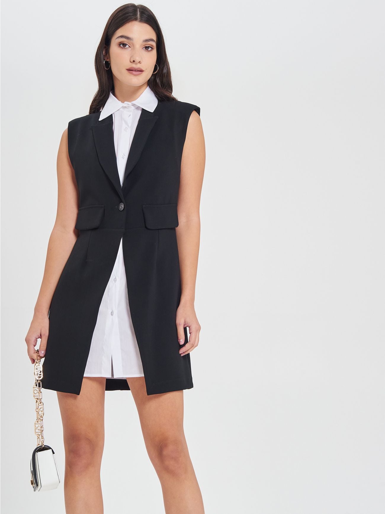 Abito Giacca: smanicato modello robe manteau, realizzato in scuba crepe. Una camicia smanicata è cucita all'interno del capo, con abbottonatura frontale. L'abito è chiusa da un bottone singolo ed ha i revers a lancia. Patte effetto tasca applicate. Cintura ricoperta removibile. Il capo è interamente made in Italy. La modella è alta 1,77 m ed indossa la taglia S. Il capo in taglia S corrisponde alle seguenti misure: lunghezza 90 cm, vita 39 cm.