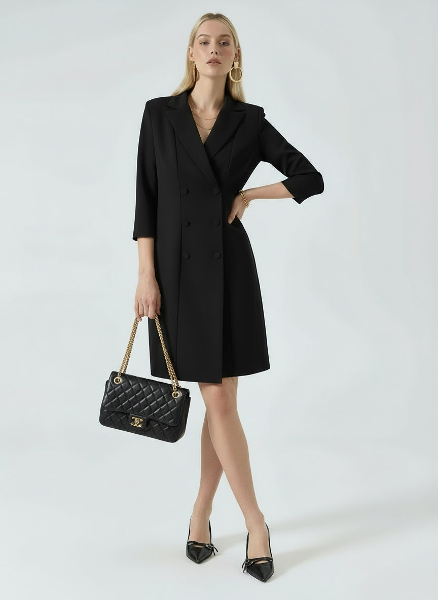 Realizzato in scuba mano crepe, l'Abito Giacca presenta una costruzione robe manteau con revers a lancia e doppia fila di bottoni rivestiti, che donano un aspetto deciso ma femminile. La silhouette strutturata valorizza la linea del corpo, mantenendo una vestibilità confortevole.