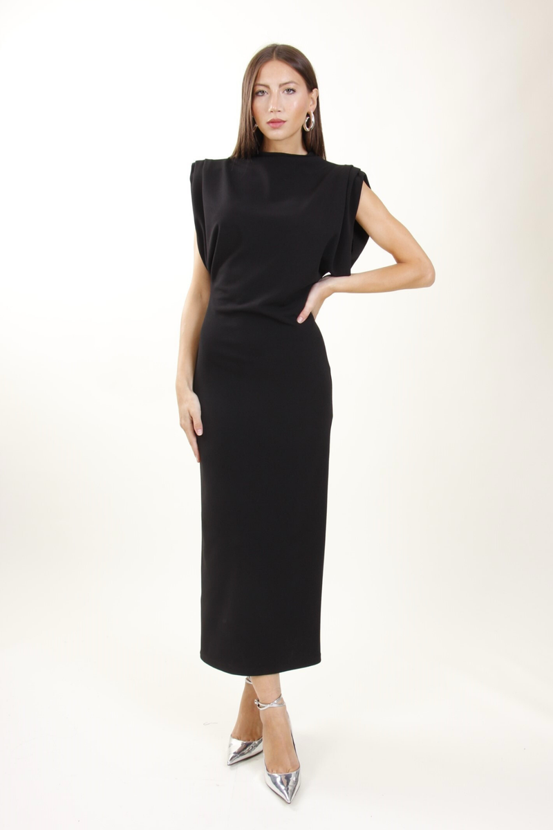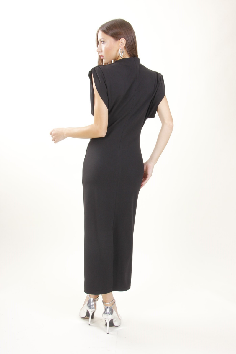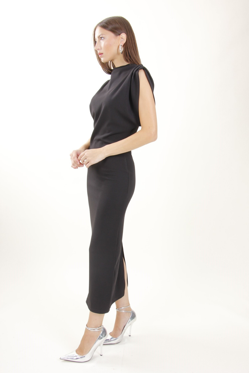Vestito attillato midi con collo alto e maniche ad aletta, con spacco. Tessuto effetto arricciato sui lati.