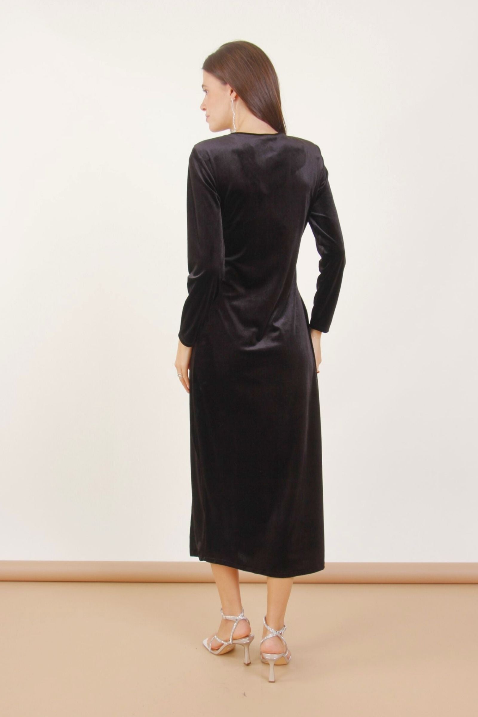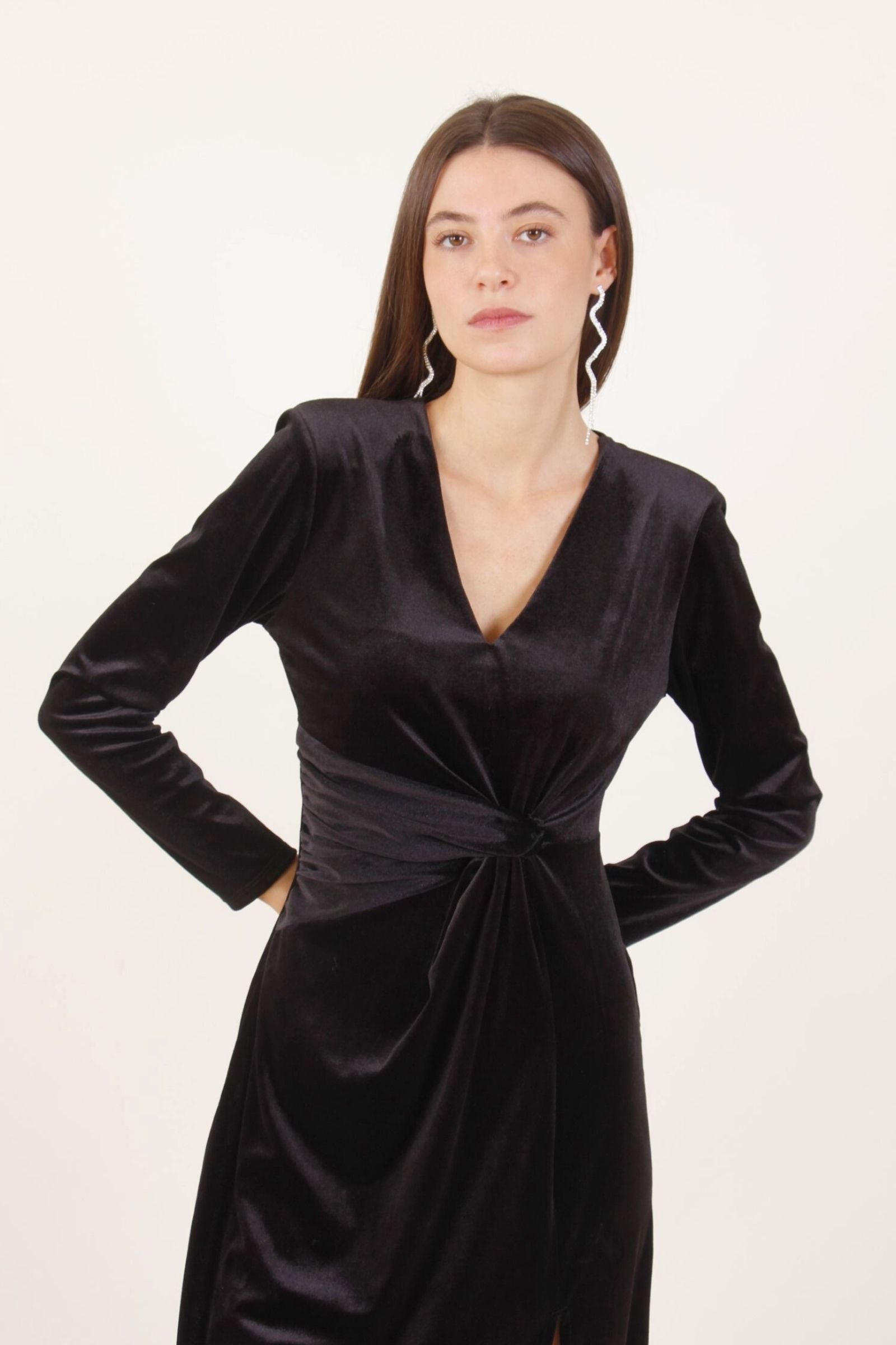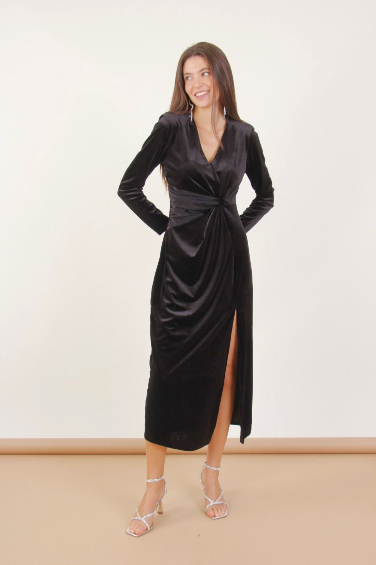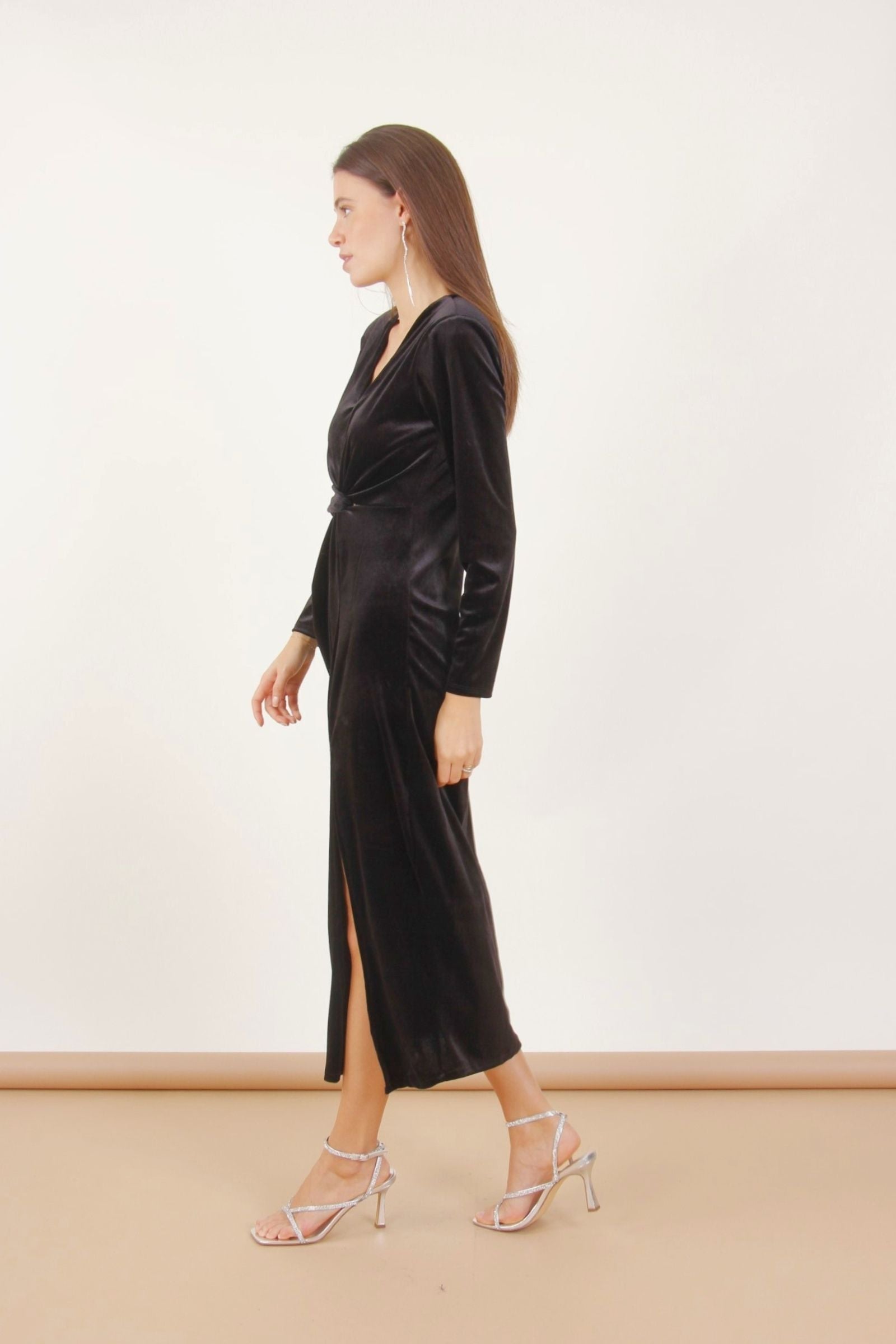 Abito lungo in velluto con drappeggio in vita, spacco e spalline imbottite.