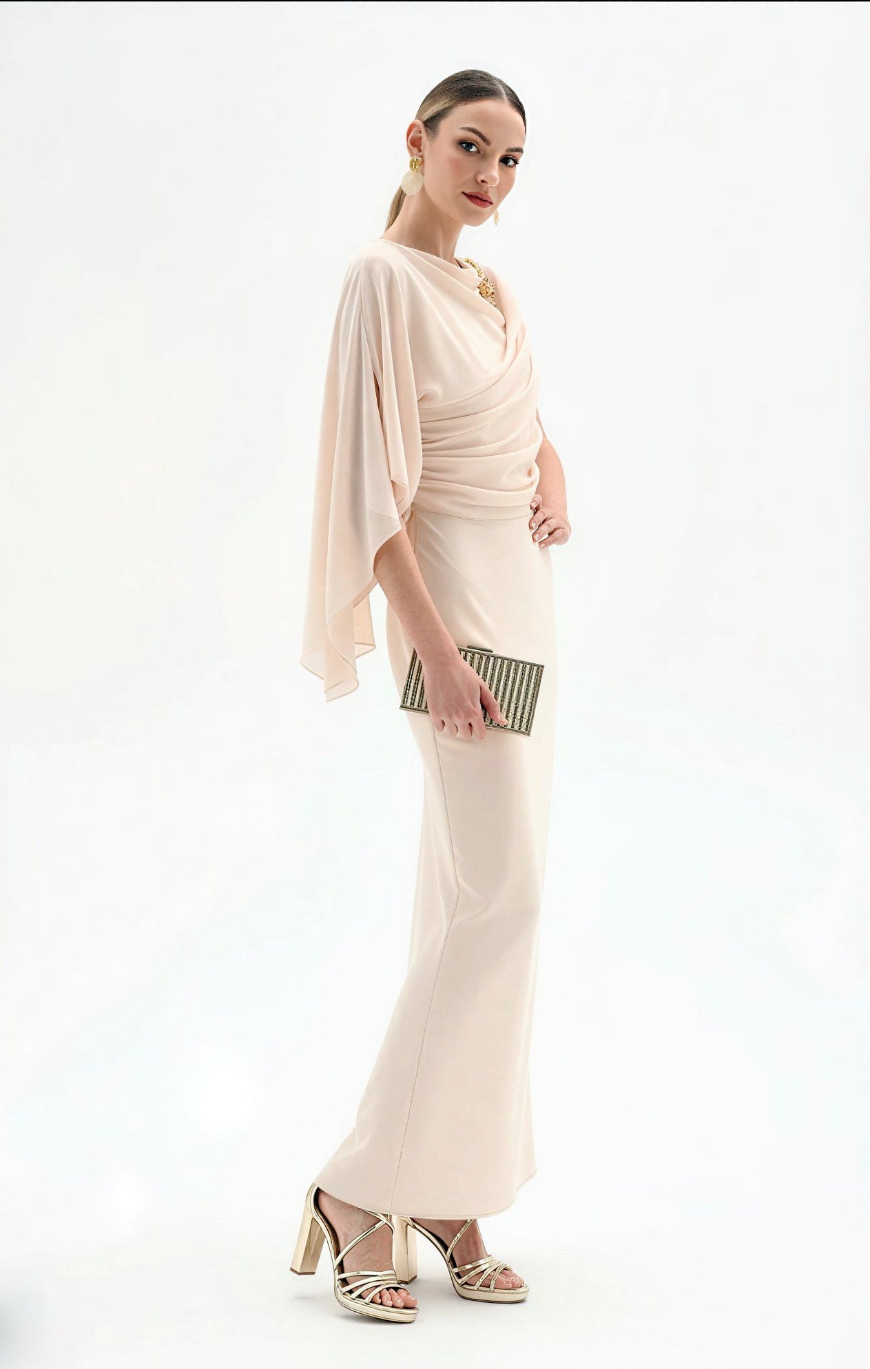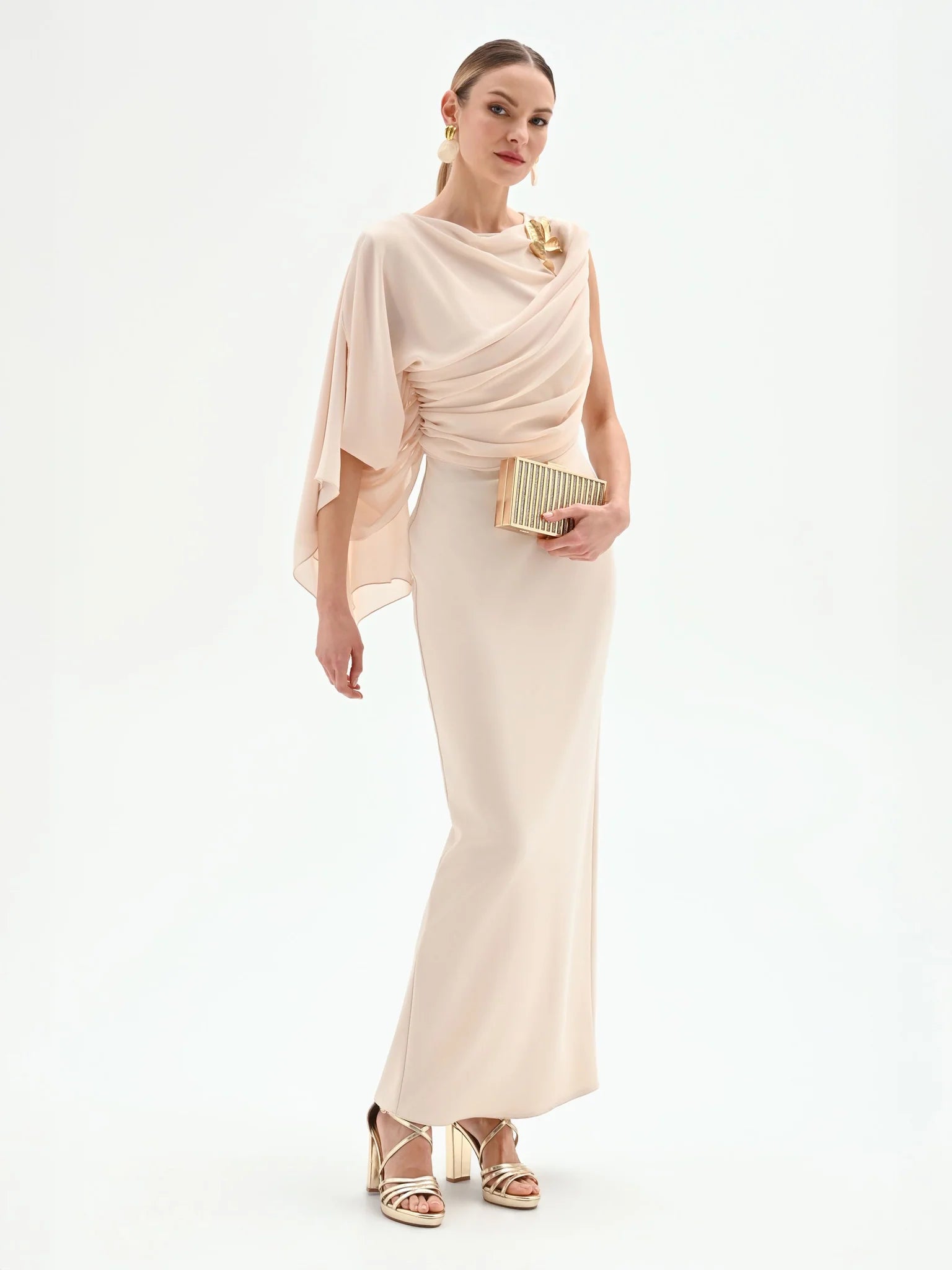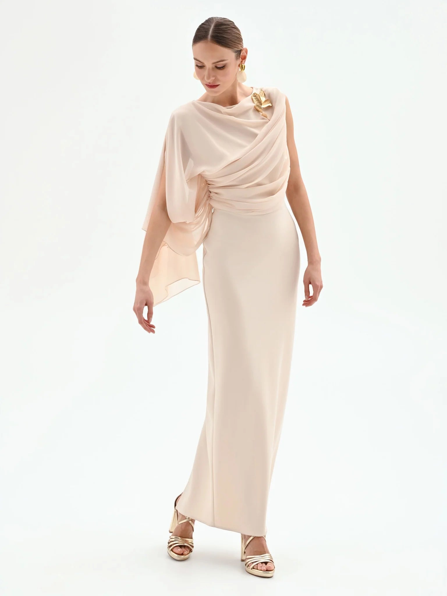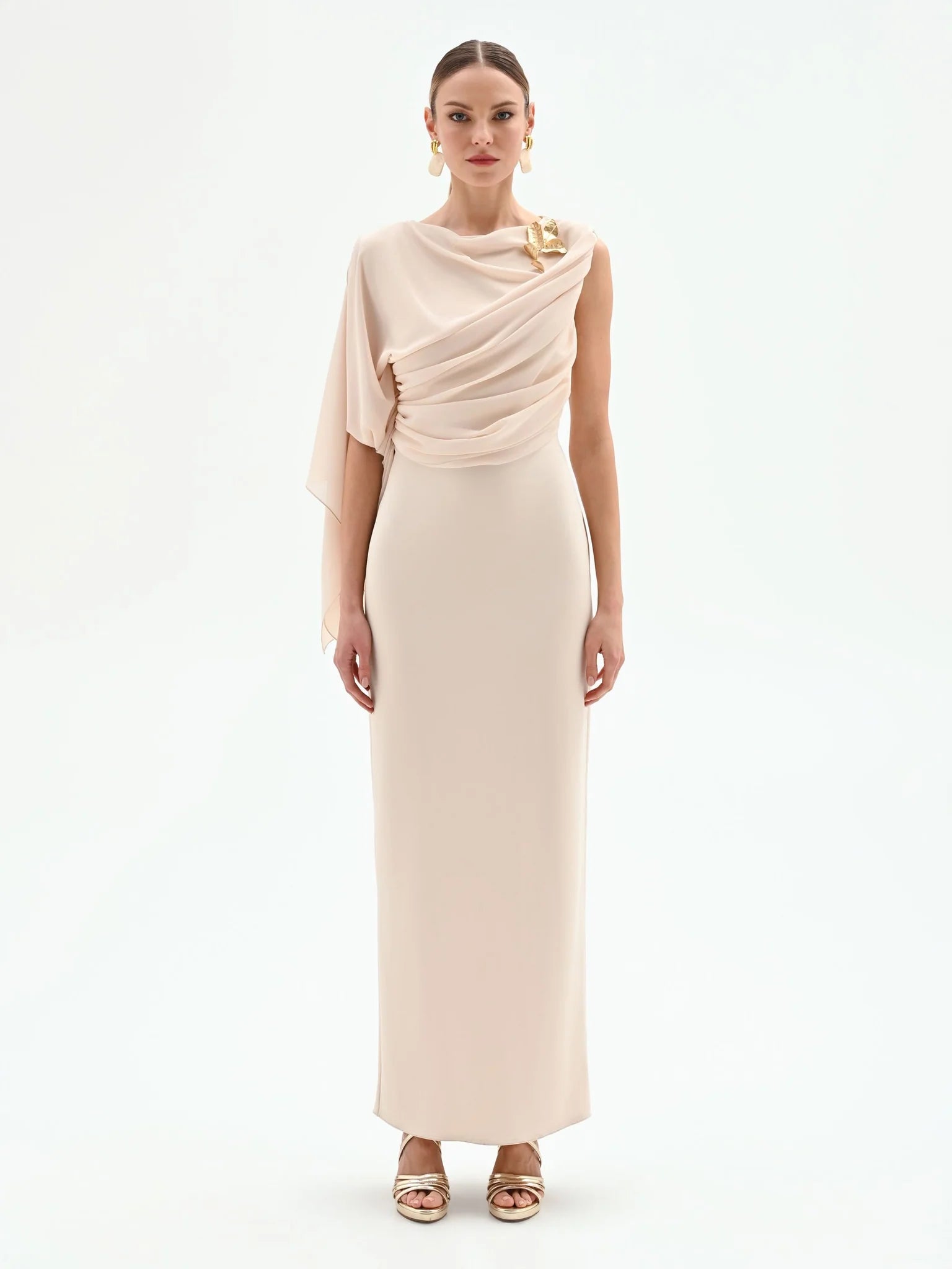 Completa il look con sandali gioiello, una clutch metallizzata e gioielli minimal per un risultato impeccabile. Il design monospalla è già statement di per sé.