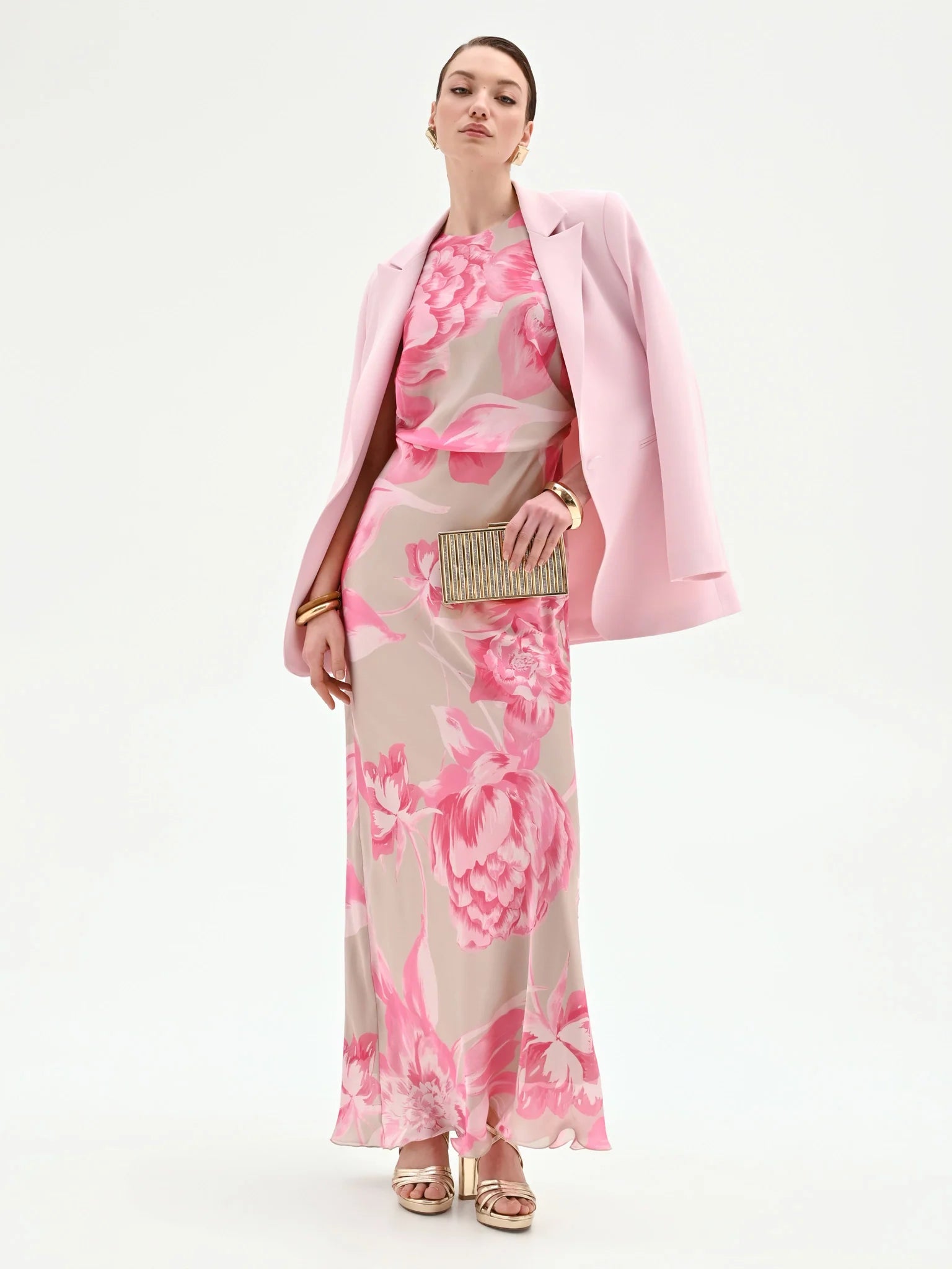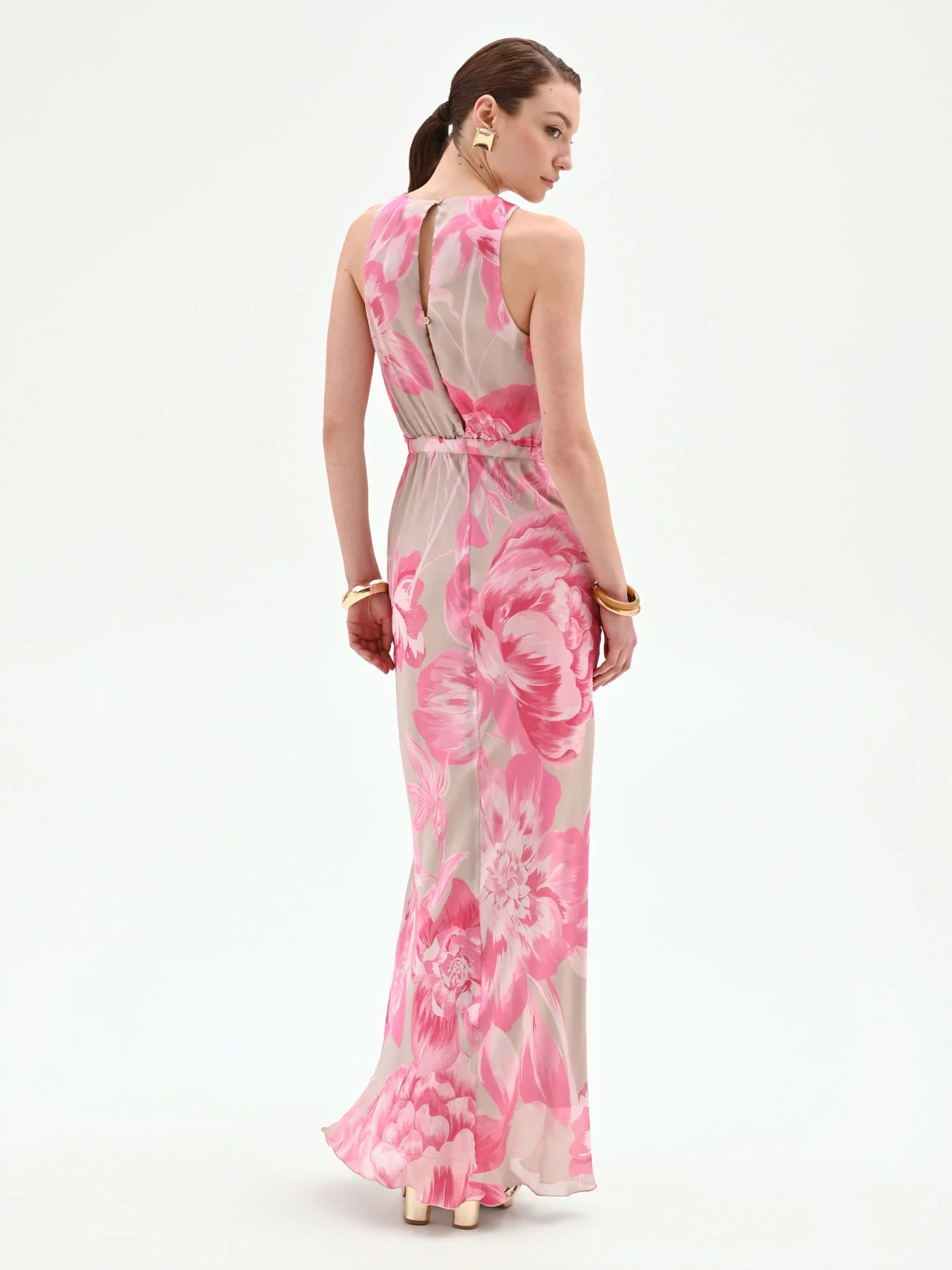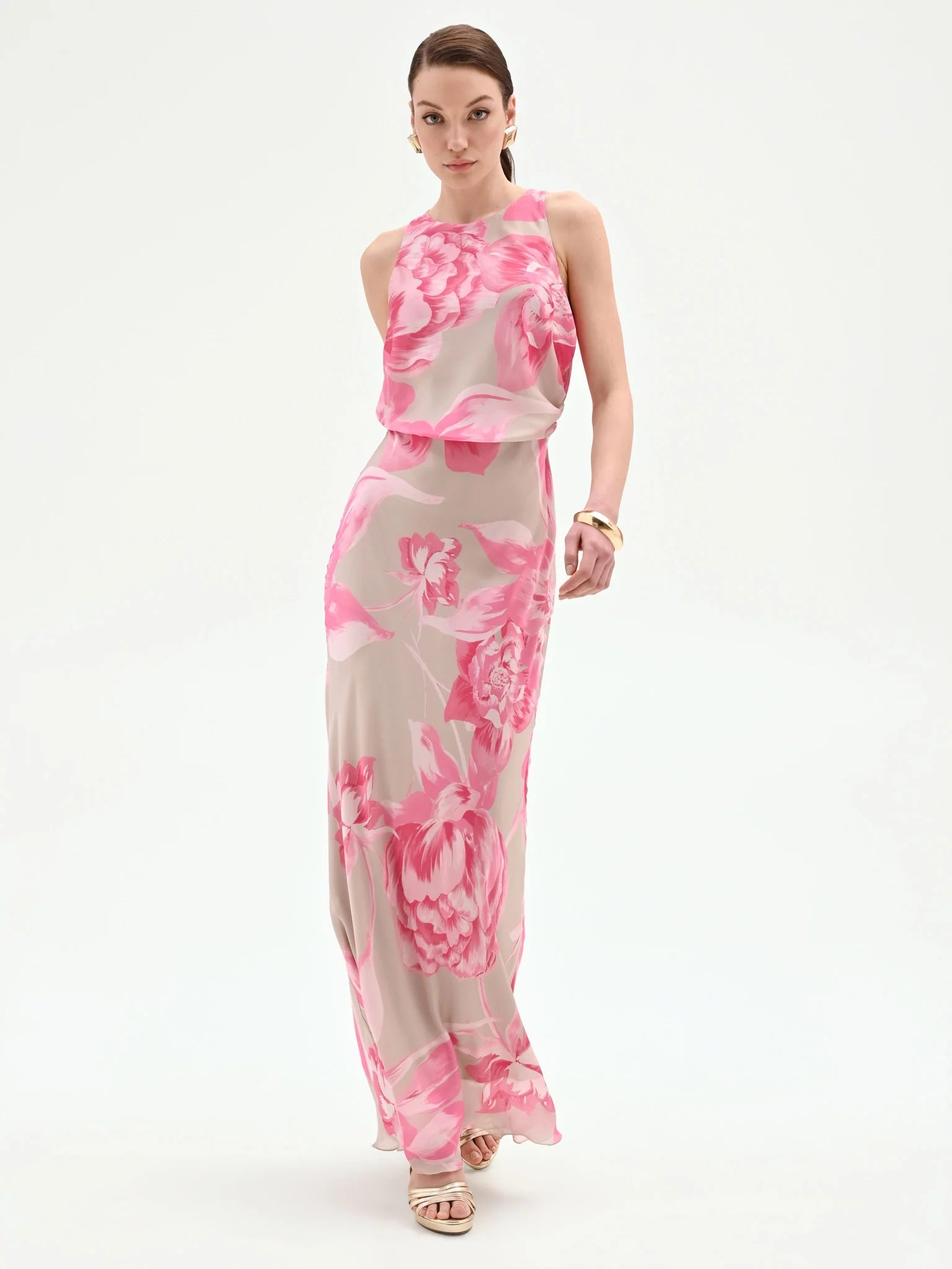 Un giardino fiorito prende vita su questo abito lungo rosa, un'espressione di femminilità romantica pensata per i momenti più importanti. Le delicate peonie, dipinte in un gioco di sfumature, sbocciano su una base neutra, creando un motivo grafico di grande impatto visivo.