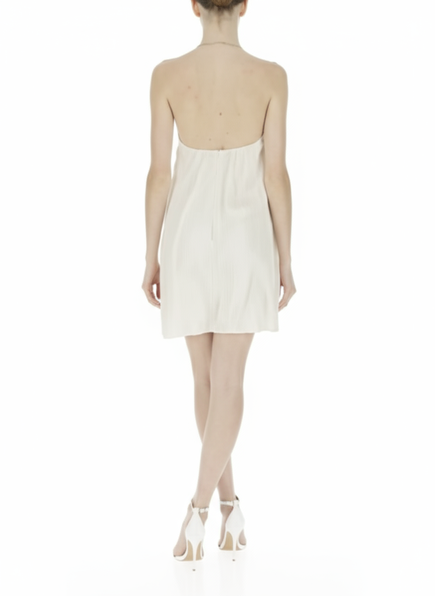 Abito Rinascimento in raso con catene al collo, scollato alla schiena. Il capo è interamente prodotto in Italia.