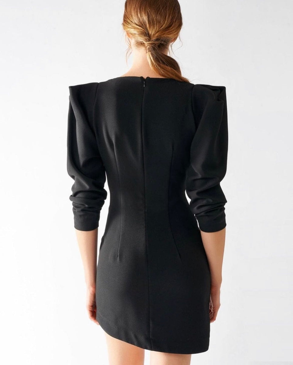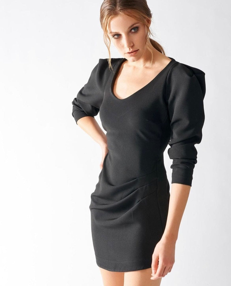 Abito Scollo Punta Rinascimento, con drappeggio laterale maniche a sbuffo, con zip per chiusura a scomparsa alla schiena. Il capo è interamente prodotto in Italia.