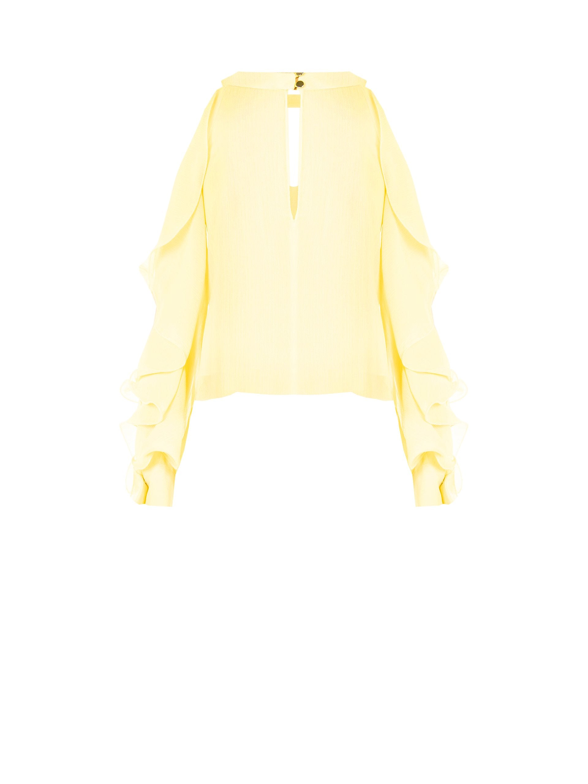 Realizzata in georgette leggermente operata, la Blusa con Rouches presenta spalle scoperte e maniche decorate da rouches che donano movimento e leggerezza alla silhouette. Il design privo di chiusura enfatizza la fluidità del tessuto e il mood raffinato del capo.