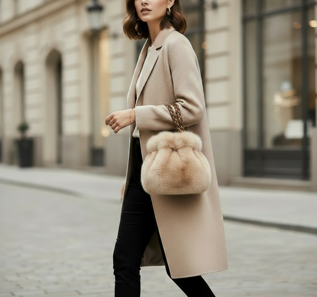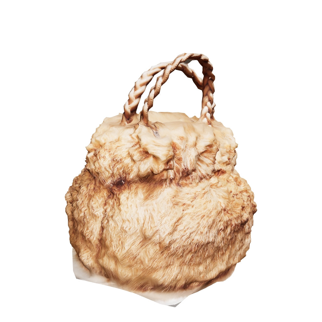 Borsa Eco pelliccia Sacco Manico intrecciato e Fondo in Ecopelle, chiusura a clips e tracolla a catena