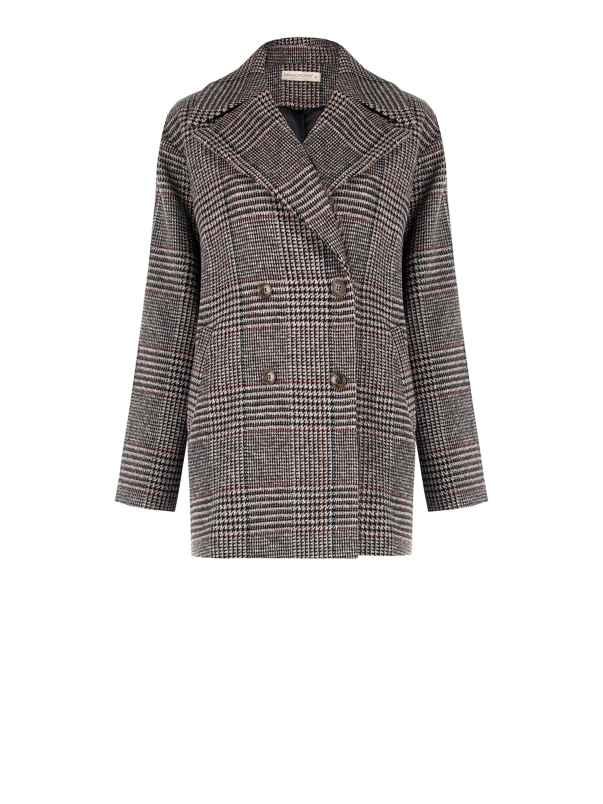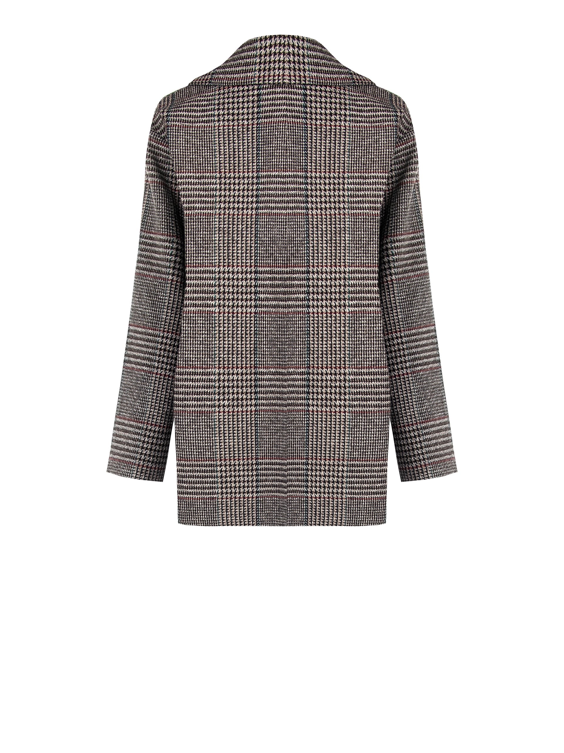 Cappotto corto in principe di Galles, un capo essenziale che unisce eleganza senza tempo e versatilità. Il motivo classico a quadri conferisce sofisticazione a ogni look, mentre la lunghezza accorciata lo rende perfetto per layering e transizioni stagionali. Ideale per chi ricerca un pezzo poliedrico che passa senza sforzo dal giorno alla sera, mantenendo un'estetica raffinata e contemporanea.