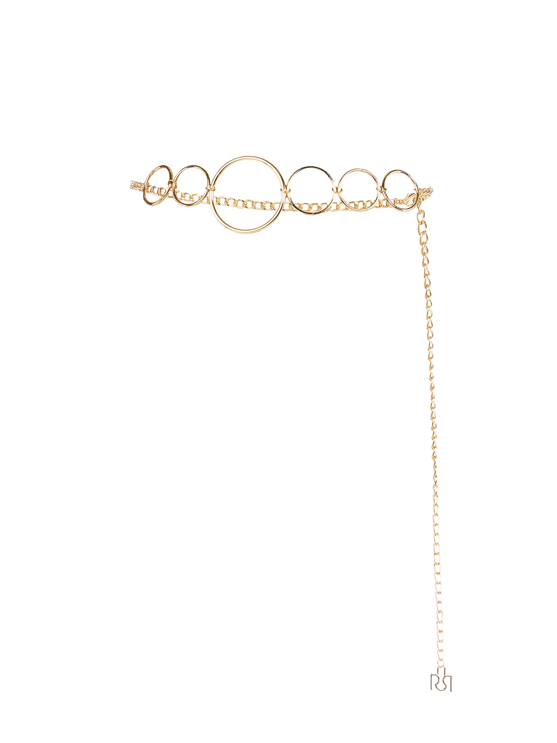 Cintura in metallo dorato composta da una sequenza di cerchi di diverse dimensioni, uniti da una sottile catena centrale per un effetto grafico e leggero. La chiusura è regolabile con gancio, mentre la catena pendente con dettaglio logo aggiunge un tocco ricercato. Perfetta per dare luce a vestiti, camicie o blazer con un dettaglio contemporaneo e originale. Lunghezza totale: 110 cm.