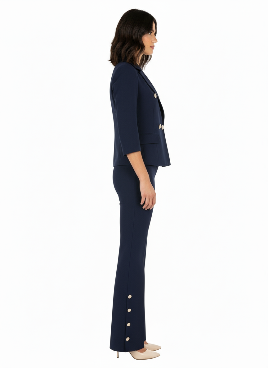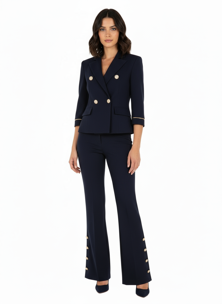 Realizzata in scuba mano crepe, questa giacca presenta una chiusura doppiopetto con bottoni dorati che aggiungono un dettaglio luminoso ed elegante. Le spalline imbottite donano struttura alla silhouette, mentre l'assenza di fodera garantisce leggerezza e comfort.