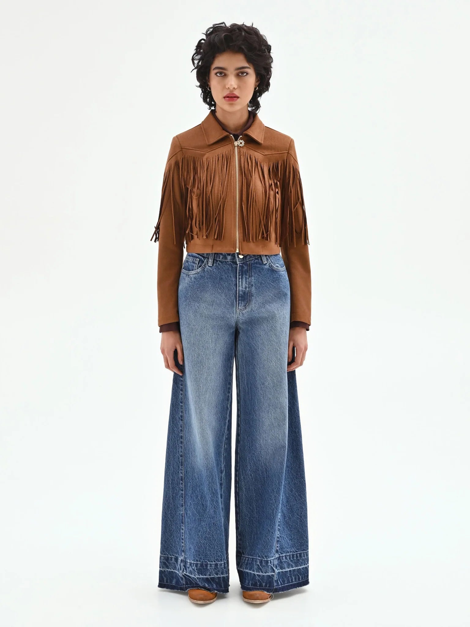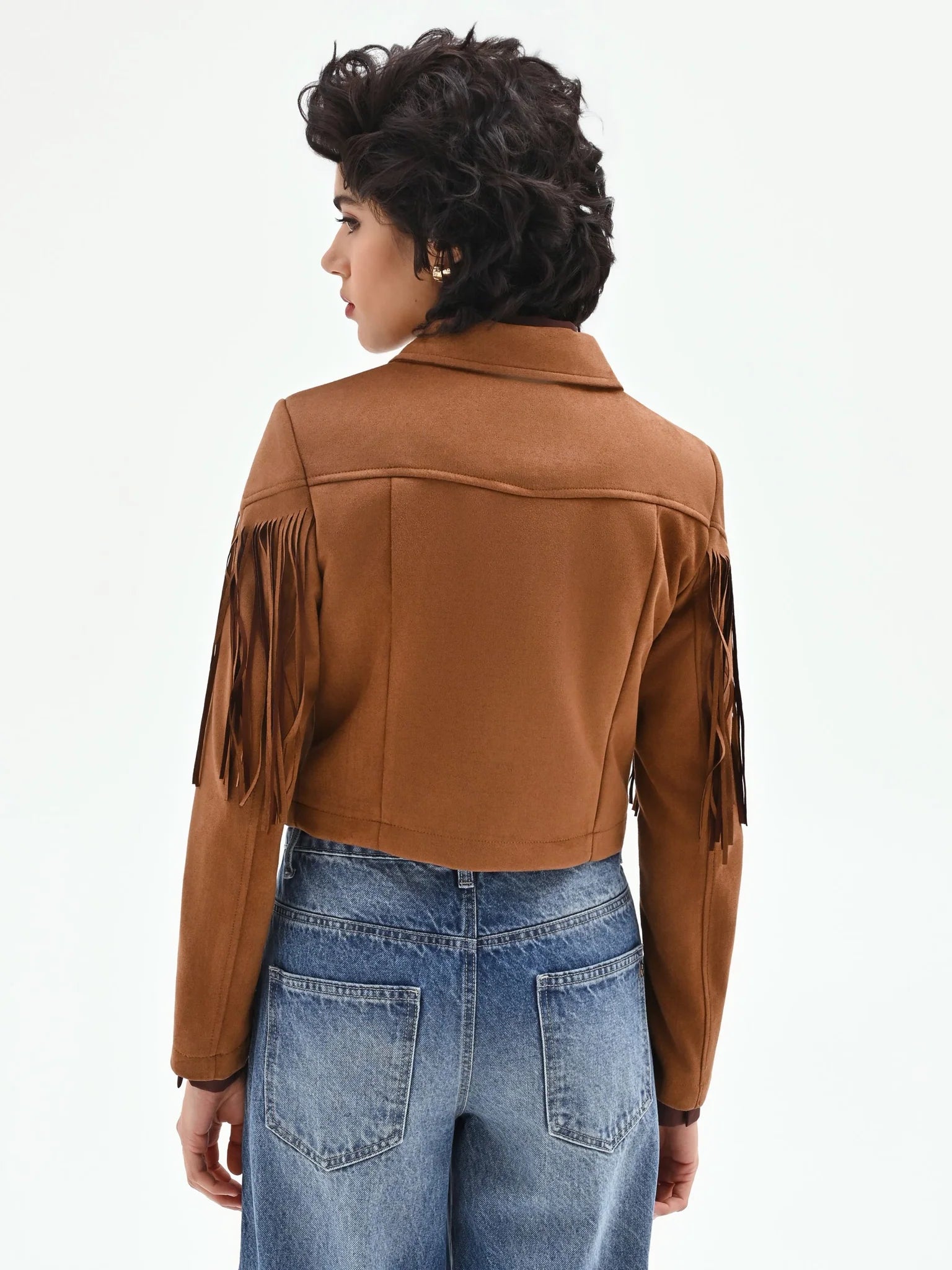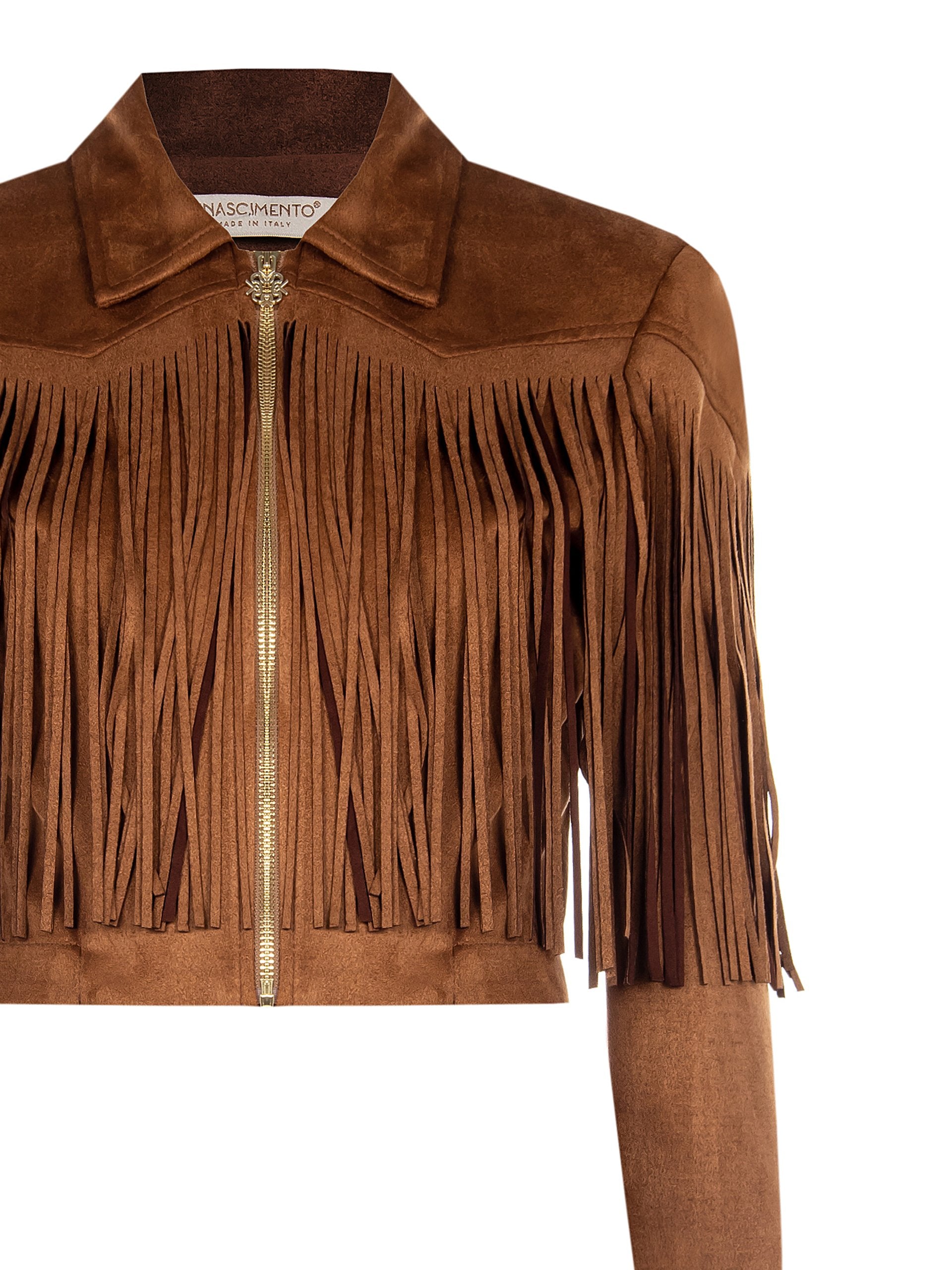 Lo spirito western si fonde con un’allure contemporanea nella giacca corta color cammello beige, un capo dal carattere deciso pensato per reinventare i look per il tempo libero e le occasioni informali. Realizzata in un morbido tessuto effetto camoscio, piacevole al tatto, questa giacca si distingue per il suo design dinamico e ricco di dettagli. La silhouette corta e grintosa è definita dal classico colletto a punta e dalla pratica chiusura frontale con zip metallica a vista, che aggiunge un tocco luminoso al capo. Le vere protagoniste sono le lunghe frange, applicate con cura sul carré e lungo le maniche, che danzano a ogni movimento creando un effetto scenografico e di tendenza. Il taglio cropped è studiato per valorizzare il punto vita, rendendola ideale da abbinare a pantaloni e gonne a vita alta. Indossala su un look total black per farla risaltare, oppure con un abito stampato per un mix&match di ispirazione folk-chic. È il capo perfetto per chi non vuole rinunciare a uno stile unico e personale nella quotidianità.