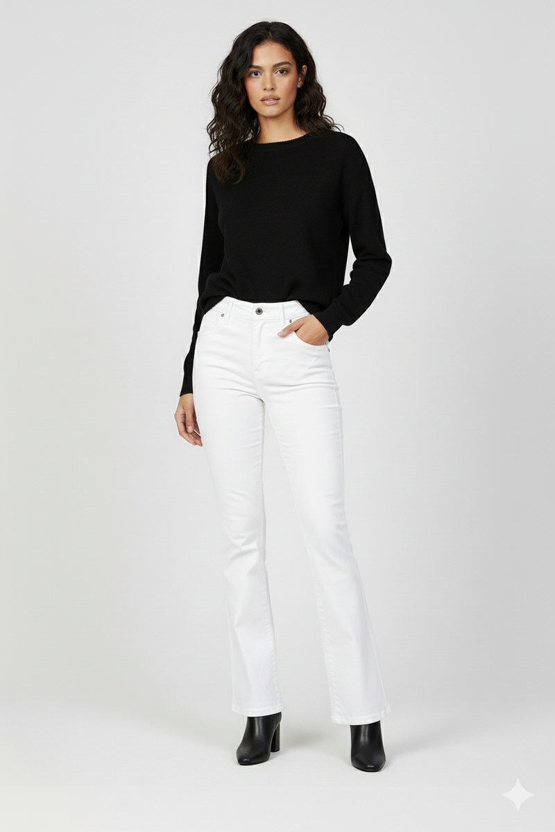 Pantalone zampa a vita alta in tessuto comfort che valorizza la silhouette con eleganza senza tempo.