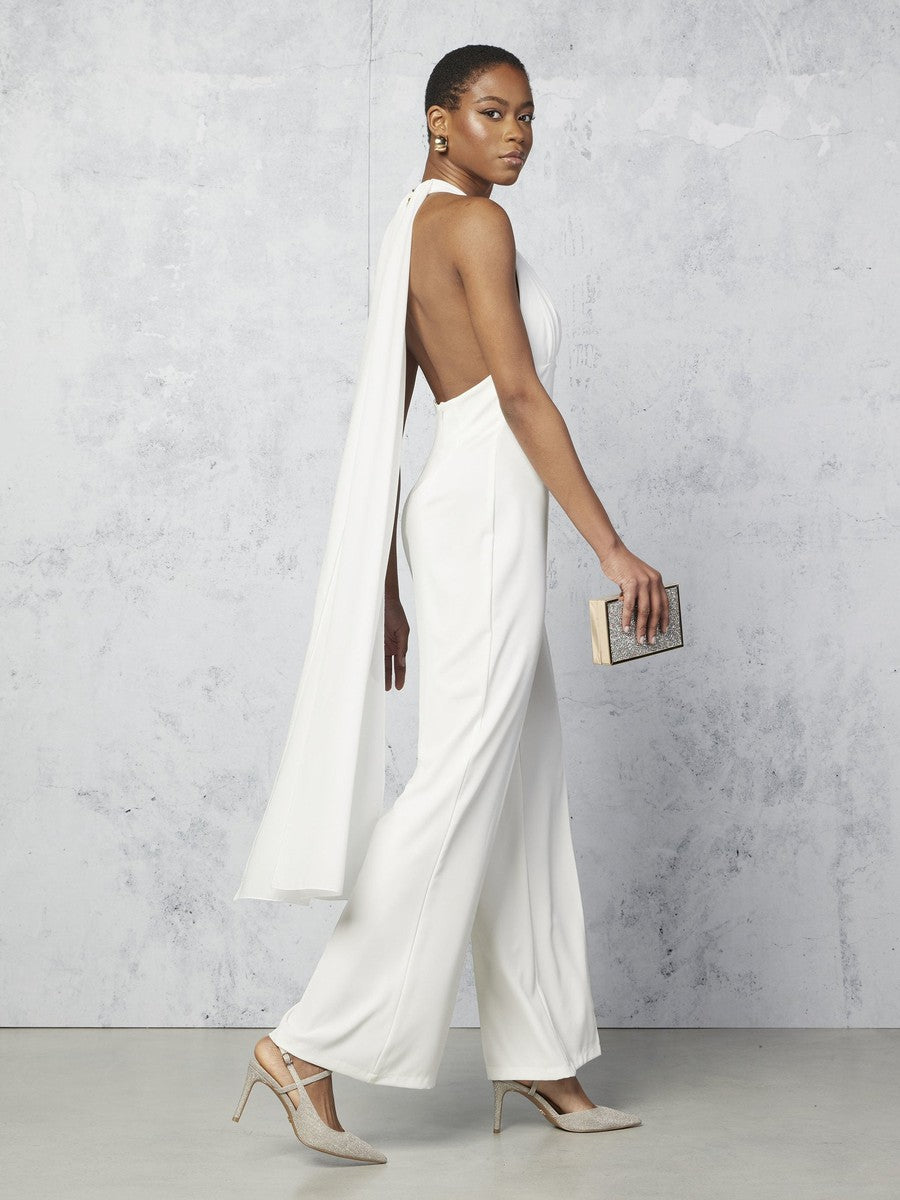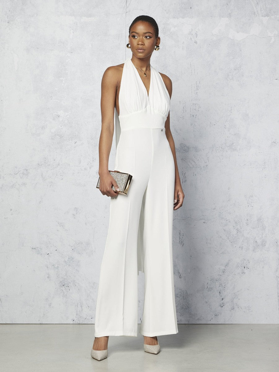Tuta a palazzo con veli , realizzata in morbido tessuto cadi. La tuta ha uno scollo a V con spalline larghe, impunture a vista che definiscono la forma del seno. Allacciatura sul retro del collo tramite gancio gioiello metallico che lascia tutta la schiena scoperta. Dal retro, scendono a cascata due veli in georgette di colore nero a tutta lunghezza, che regalano eleganza al capo, rendendolo perfetto per un grande evento serale. I pantaloni della tuta sono a palazzo. Il capo è interamente made in Italy. La modella è alta 1,75 ed indossa la taglia S.