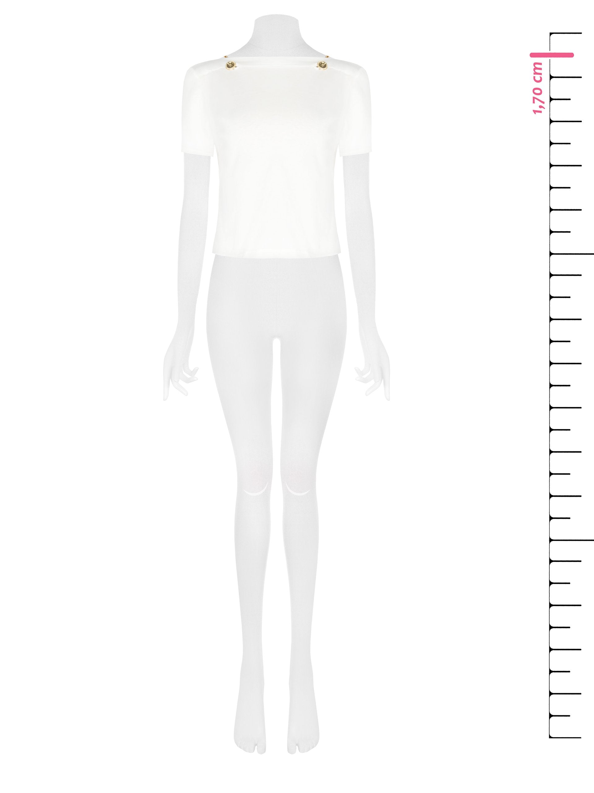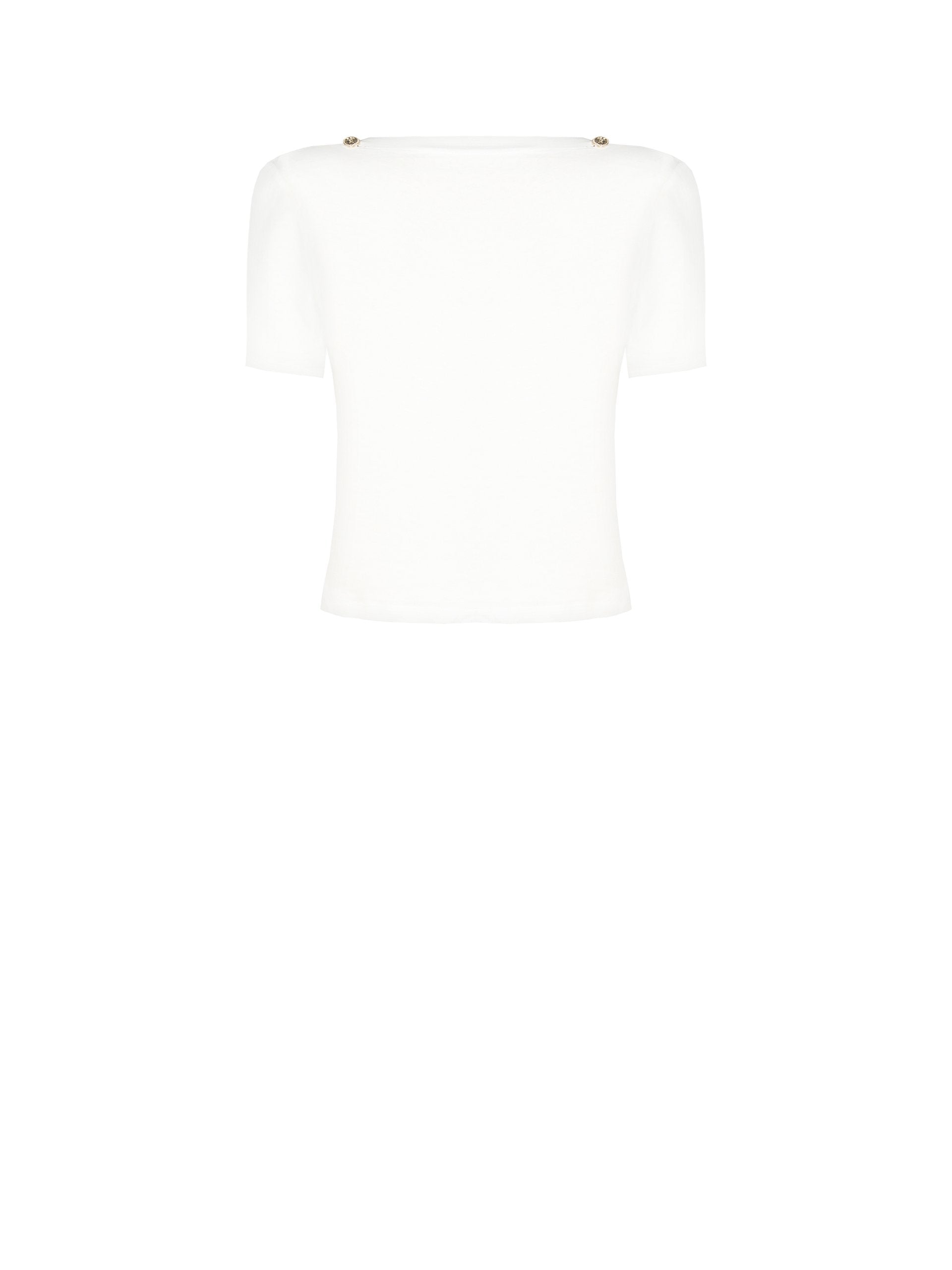 La T-shirt con dettagli oro è la rivisitazione di un capo essenziale, pensato per la donna che cerca un equilibrio tra comfort e femminilità nel suo abbigliamento quotidiano. Questo modello si distingue per il suo design pulito, con uno scollo a barchetta che incornicia elegantemente il décolleté e valorizza le spalle. A impreziosire la linea semplice del capo sono i bottoni decorativi in metallo dorato, lavorati a rilievo e posizionati strategicamente, che aggiungono un punto luce e un tocco distintivo. La silhouette dritta e la vestibilità regolare assicurano una sensazione di agio per tutta la giornata, rendendola una scelta pratica e versatile.