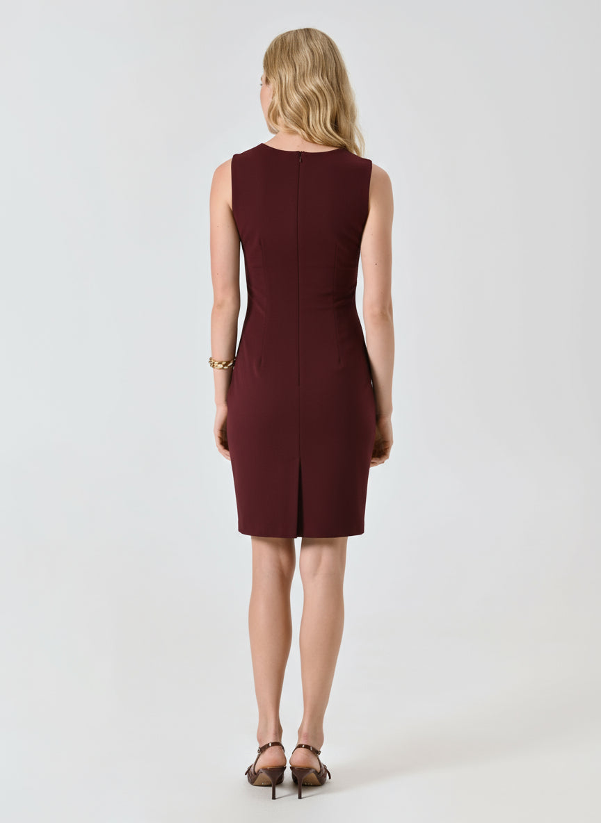 Realizzato in punto Milano, il Tubino Drappeggiato si distingue per il drappeggio cucito sul fianco che valorizza la silhouette e la gonna sormontata effetto portafoglio con taglio asimmetrico. La chiusura con zip posteriore garantisce una linea pulita e una vestibilità comoda.