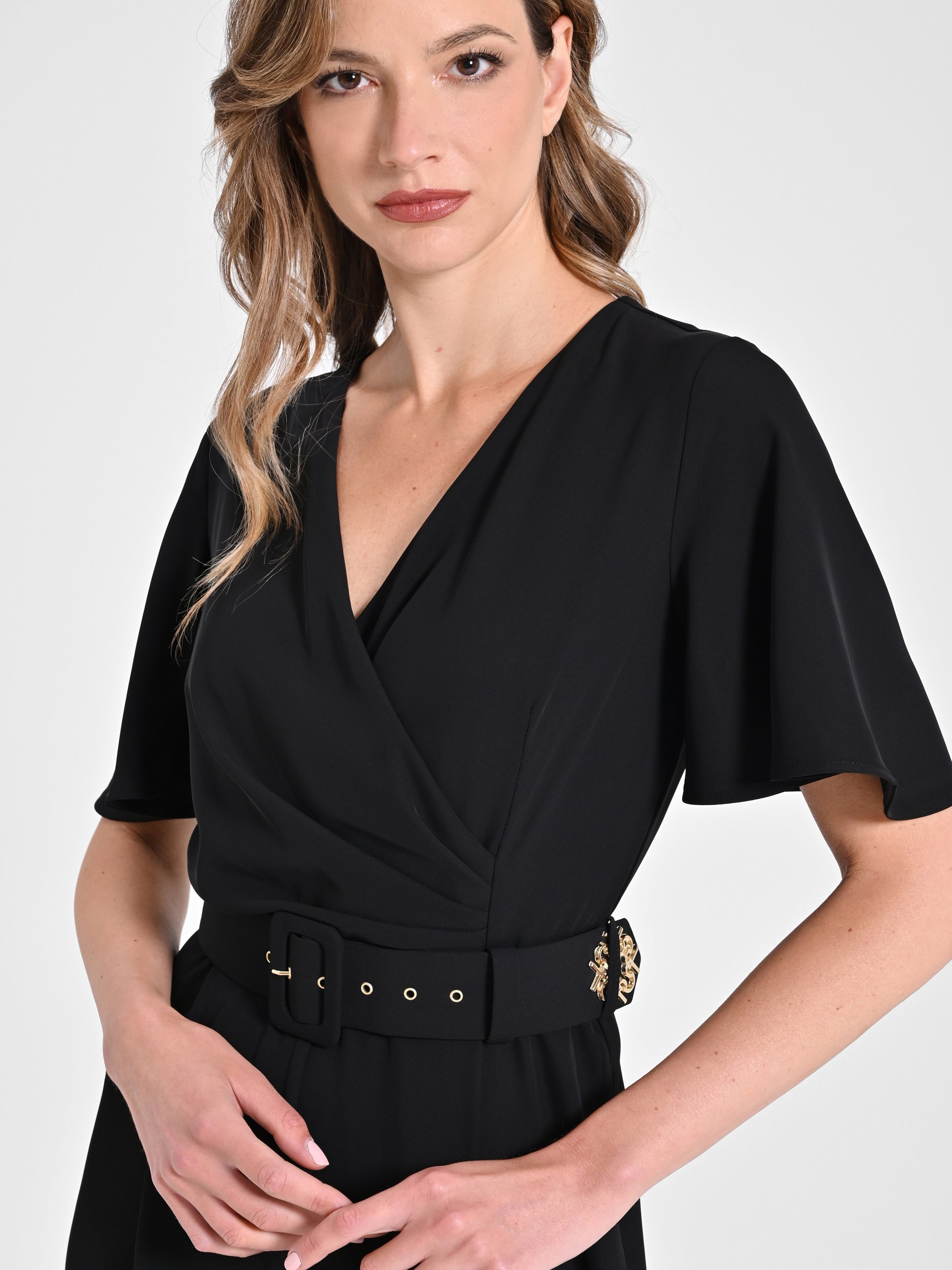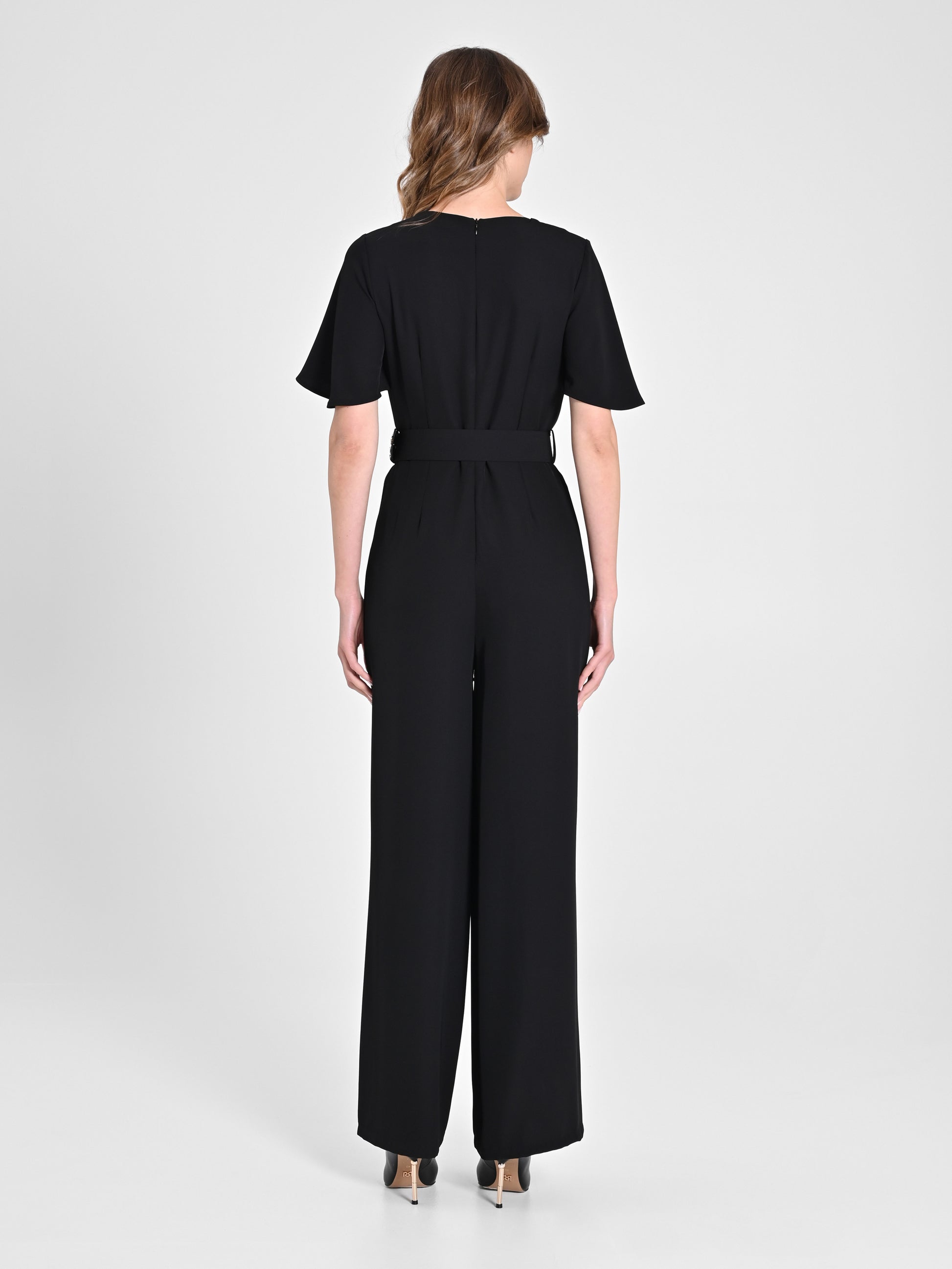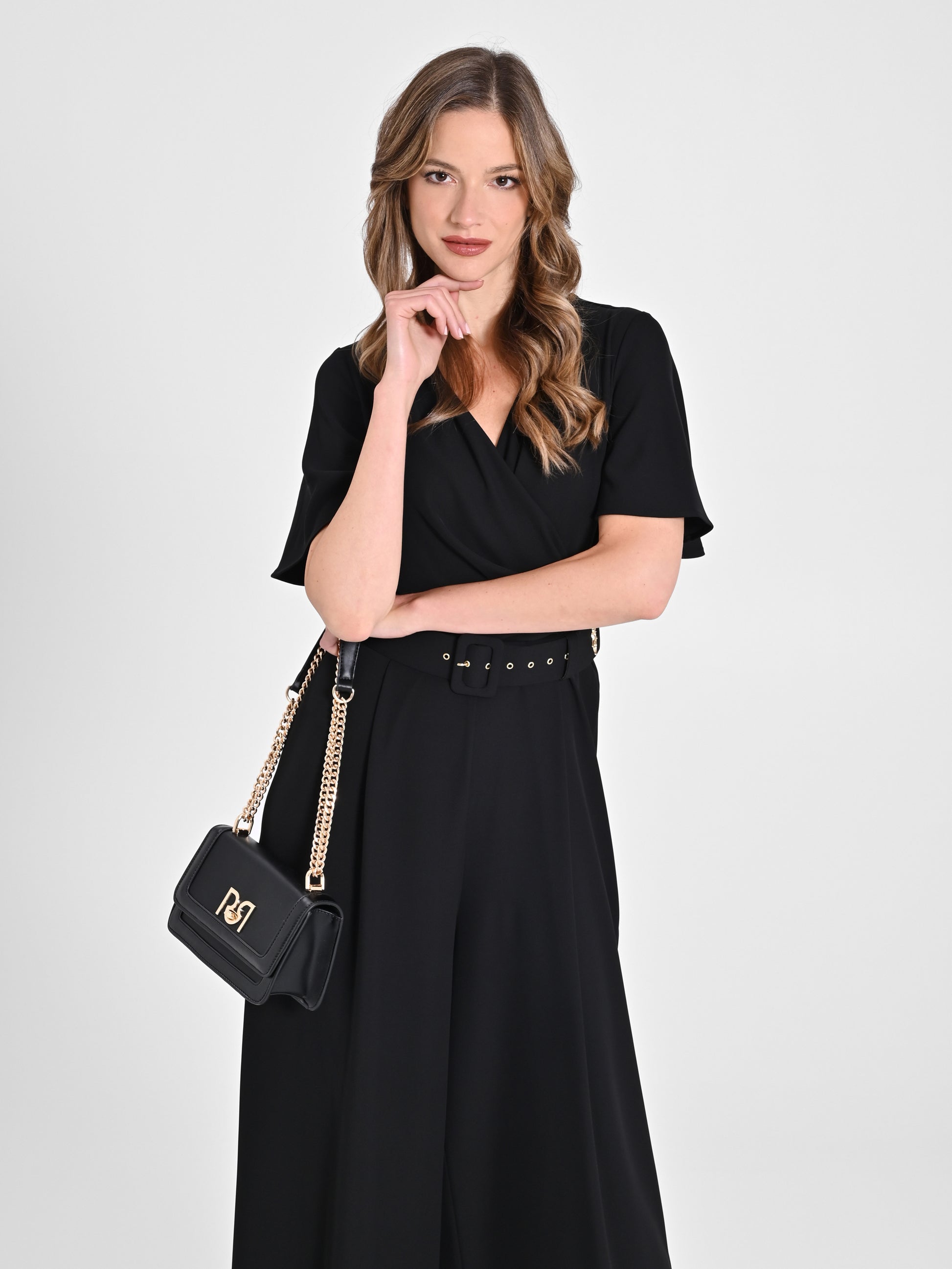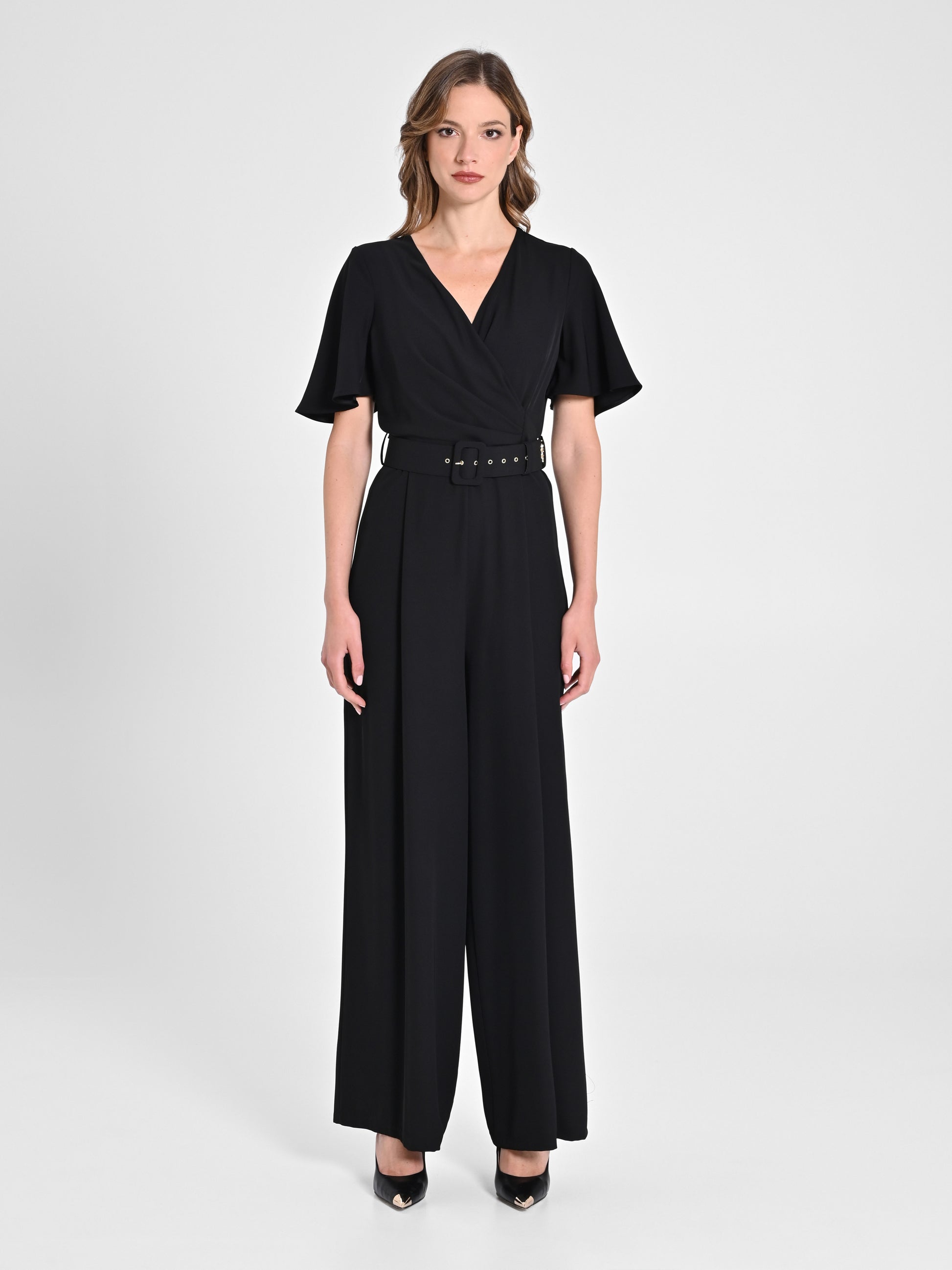 Tuta con pantaloni a palazzo, realizzata cadi, tessuto fluido leggero. La tuta ha le maniche corte ampie, ad aletta. . Il punto vita è evidenziato da una cintura ricoperta, che può essere rimossa. Chiusura posteriore tramite zip invisibile. Lo scollo è a "V" ed intrecciato. Completa il tuo outfit ed acquista insieme alla tuta con maniche ad aletta la nostra collezione di accessori e calzature eleganti. Il capo è realizzato interamente made in Italy. La modella è alta 1,78 m ed indossa una taglia S. Il capo in taglia S corrisponde alle seguenti misure: Il seno misura 43 cm, la vita misura 35 cm,la lunghezza è 149.5 cm.
